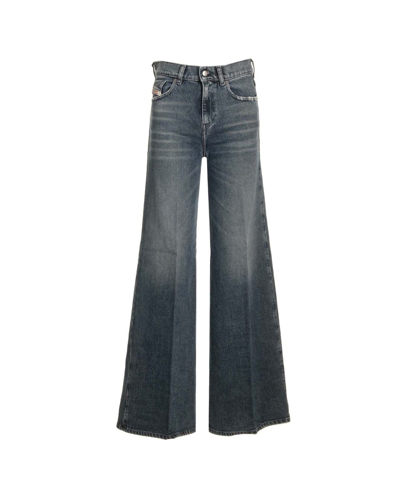 "1978 D-AKEMI" jeans from Diesel with medium waist and flare leg, fitted at the waist and softer from the thigh to the ankle. Made of slightly stretch recycled cotton, slightly worn vintage blue wash.