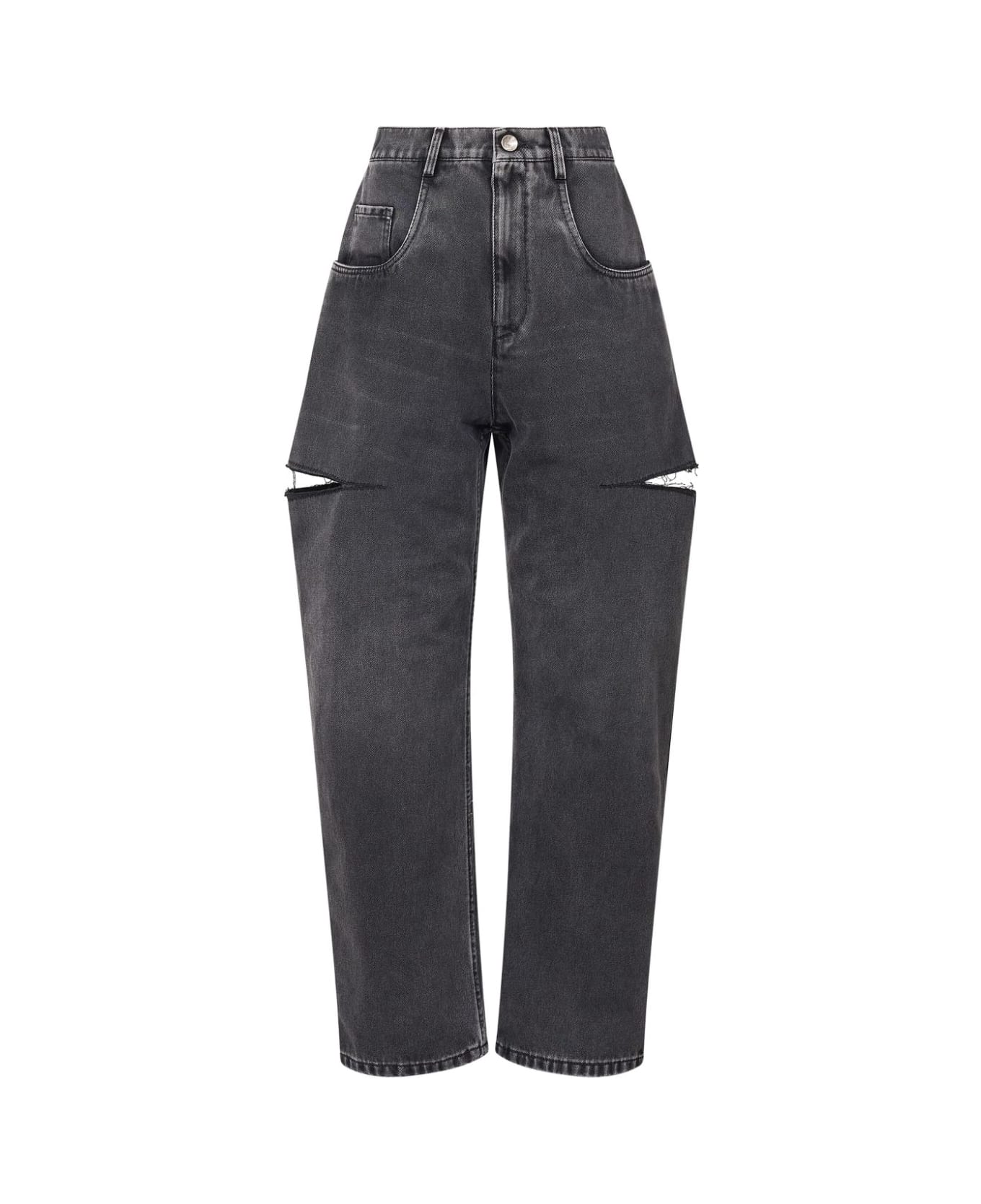 black cotton denim cut-out detailing signature four-stitch logo high-rise belt loops concealed fly and button fastening classic five pockets tapered leg
