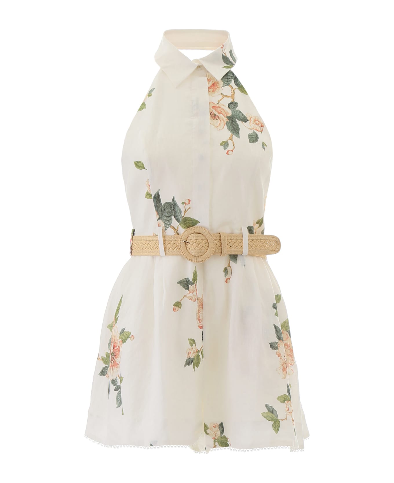 Zimmermann pure linen playsuit with floral pattern and removable raffia belt. It features halterneck, point collar, concealed buttons on the front and concealed zip on the back. Two side slit pockets, trimmed hem. Model height is 177 cm and she is wearing a size 2.
