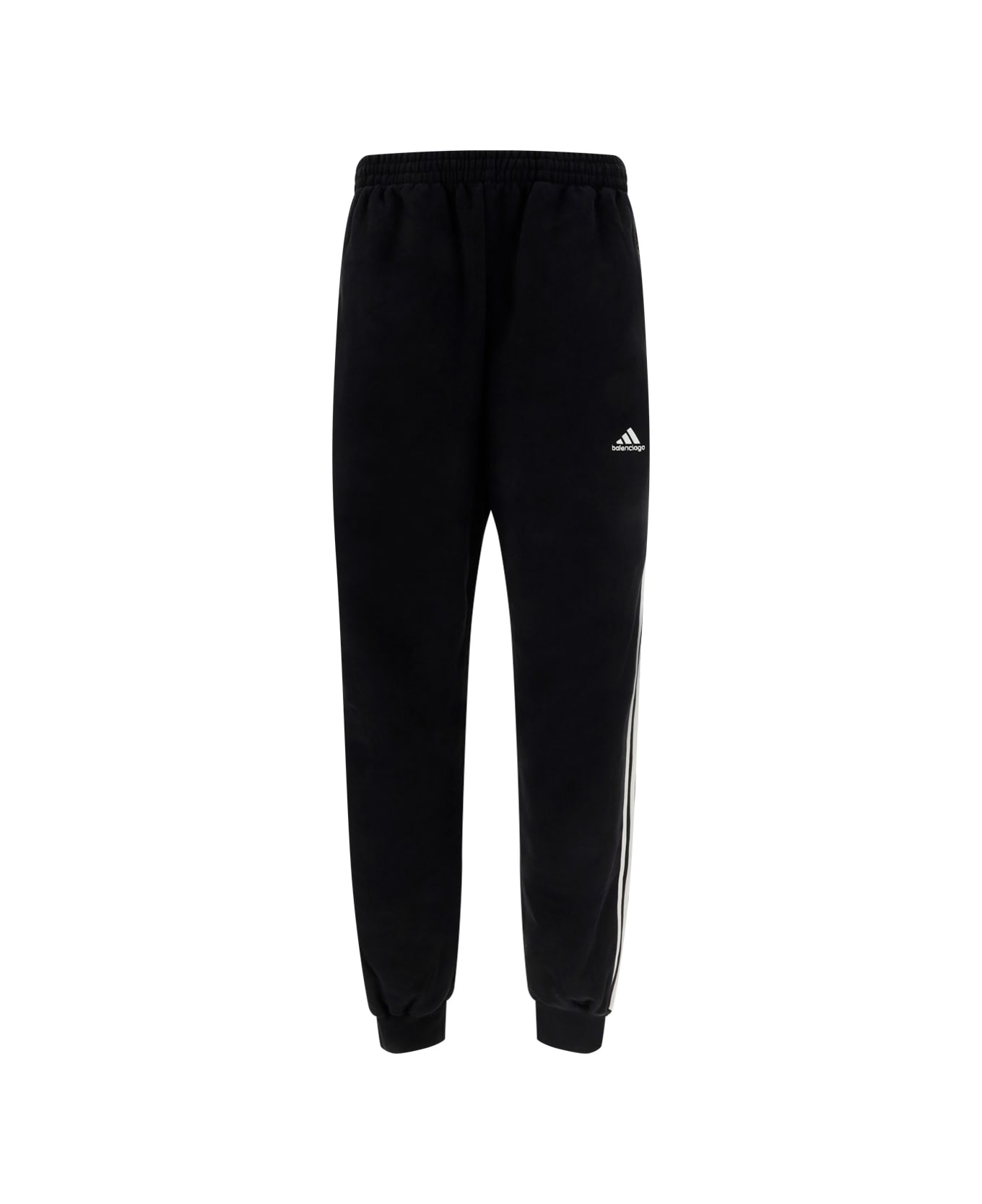 Cotton sweatpants by balenciaga for adidas, jogger style, elasticated waistband with drawstring, two side welt pockets, iconic contrasting adidas bands on side panels, iconic contrasting embroidered logos of both brands on the front.