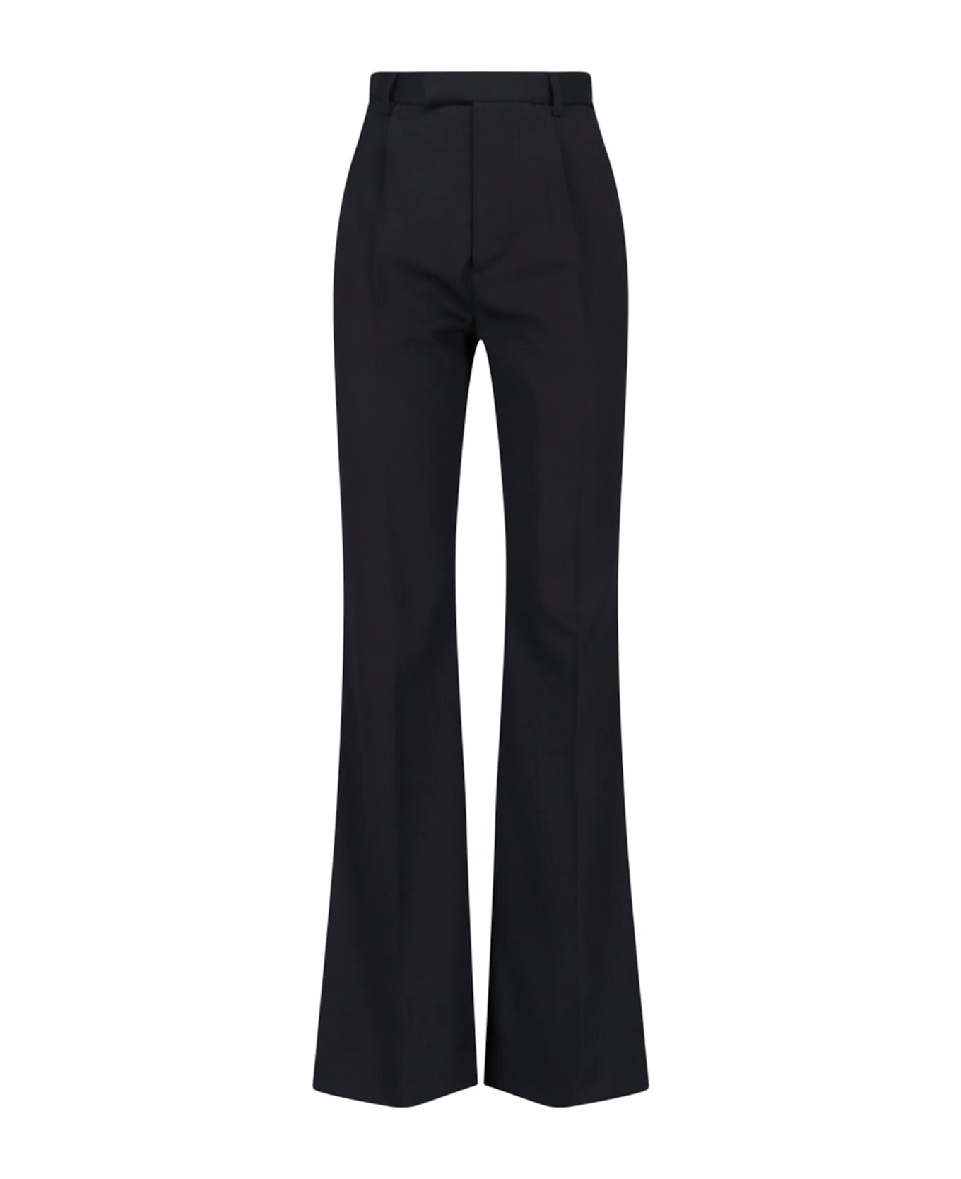 Vivienne Westwood virgin wool bootcut trousers in black with high waist, belt loops, hook and zip closure, two side pockets, front pleats, back button pocket, wide leg. Composition: 100% Virgin Wool