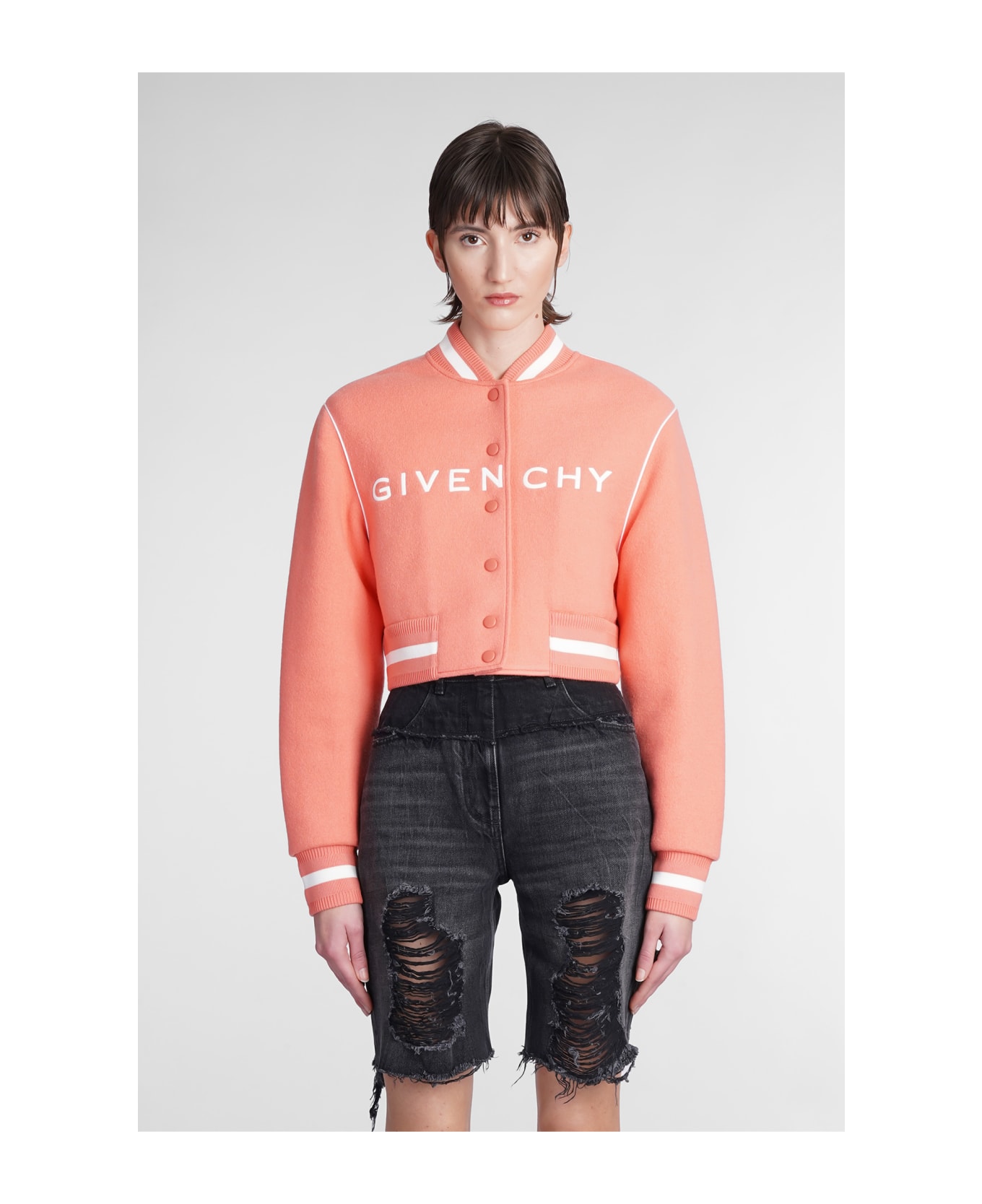 Bomber in rose-pink wool, crop cut, long sleeves, ribbed cuffs and bottom, frontal buttoning, pockets, front logo, 100% lambskin, Made in China, Model is 180 cm and wear a size S