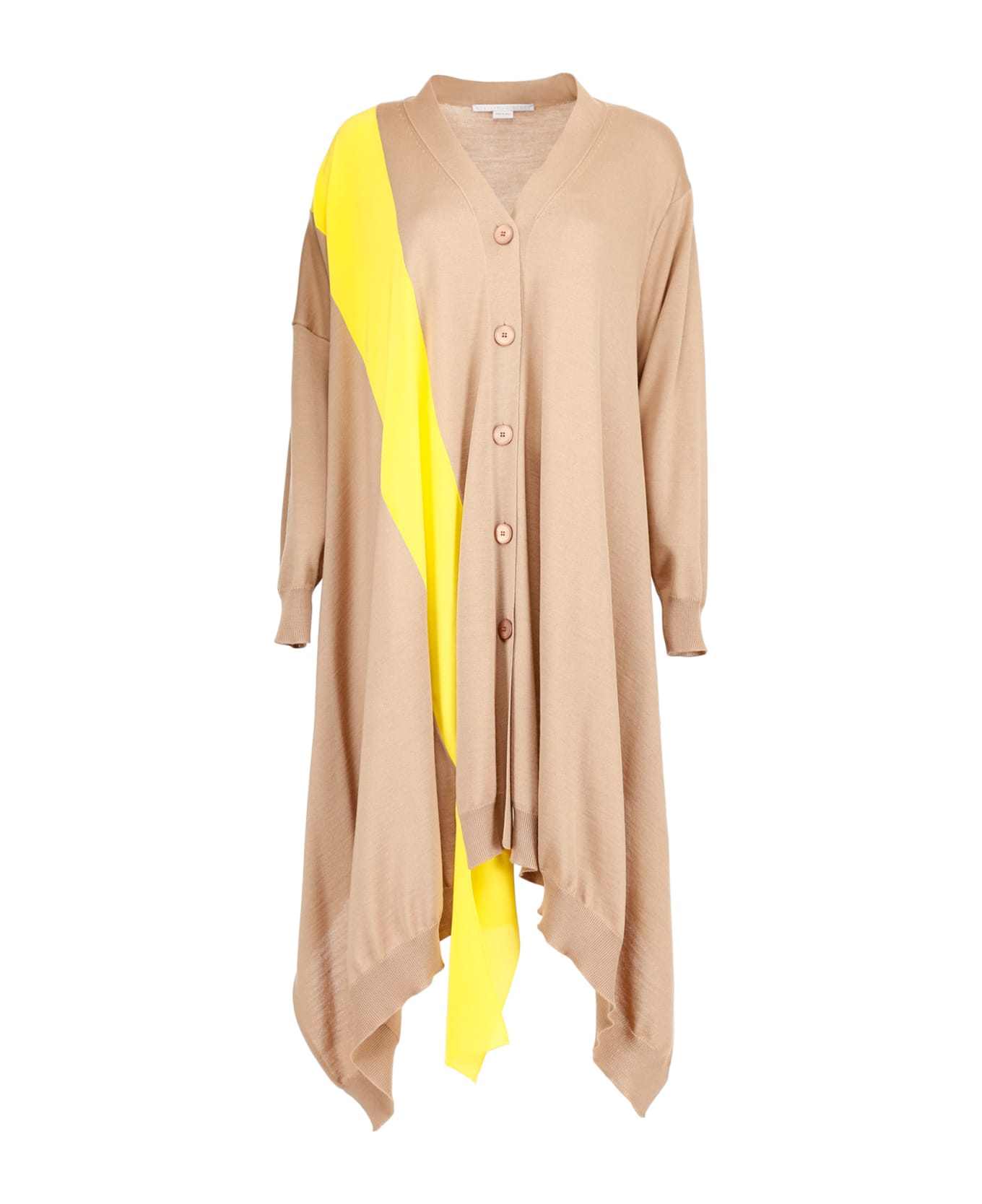 Stella McCartney shaved wool cardigan with side contrast crepe de chine insert. Oversized fit, dropped shoulders, asymmetric hem and button closure. Ribbed hems. Model height is 177 cm and she is wearing a size IT 38.