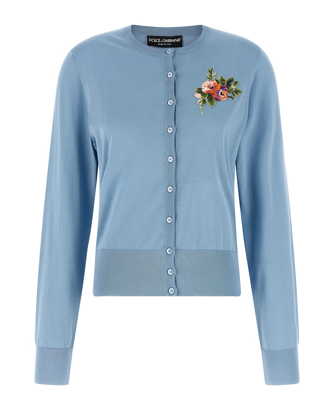 Silk cardigan, patch with floral embroidery and front beads, mother-of-pearl button closure, crew neck, long sleeves with cuffs, band on the hem. Composition: 100% silk