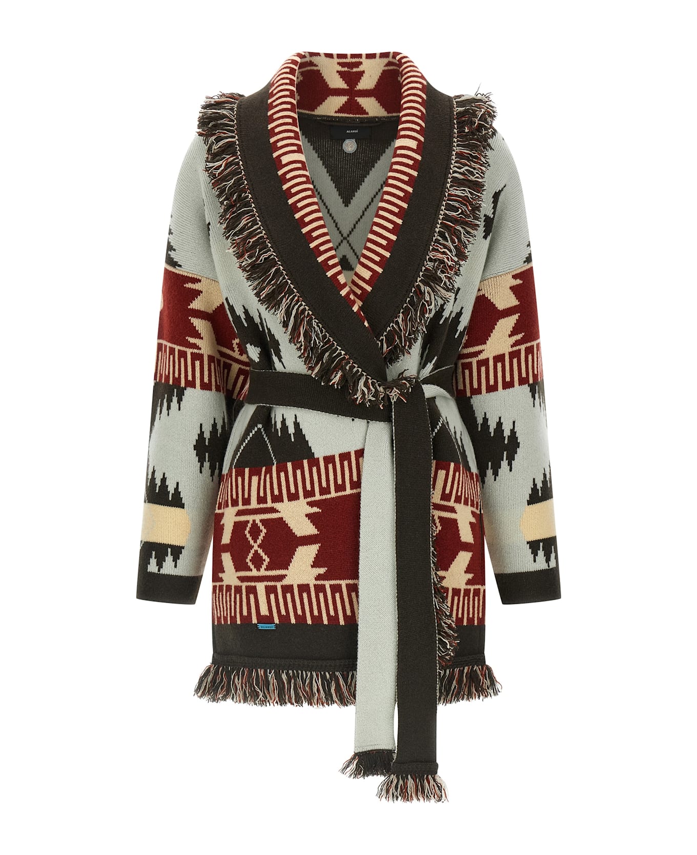 'Icon' cashmere and linen cardigan crafted in a double jacquard all-over 'Alanui' pattern, dressing gown style with shawl neckline and frayed edges, long sleeves, pockets, removable belt.