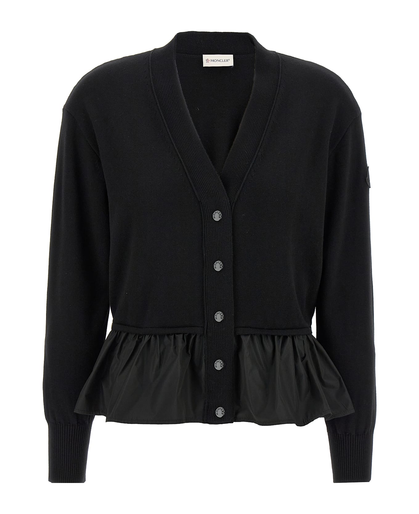 Cardigan in cashmere and cotton blend, peplums on the bottom in water-repellent technical fabric, snap button closure, V-neck, long sleeves with cuffs and tone-on-tone logo patch. Composition: 100% polyester