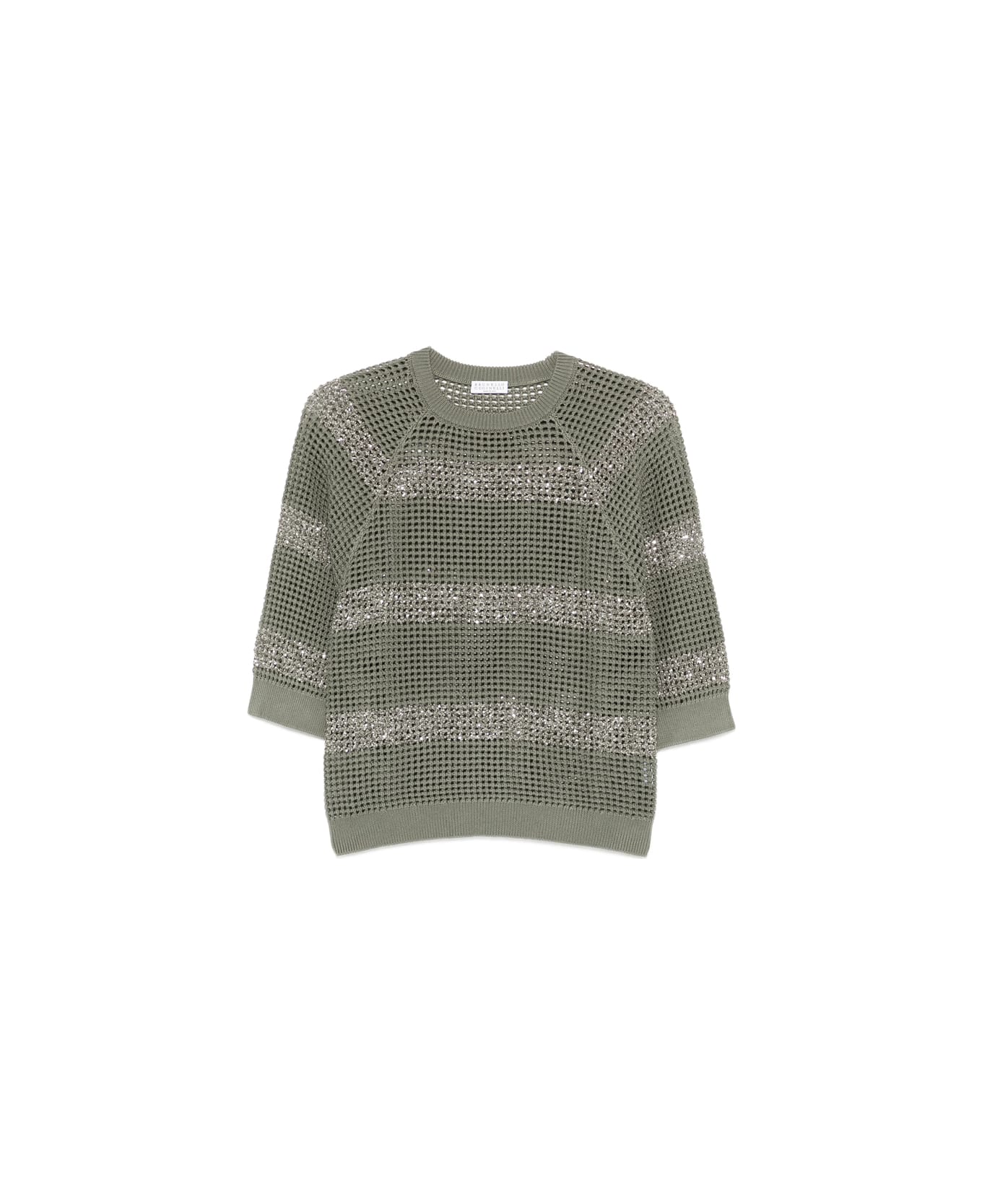 green open knit sequin embellishment round neck three-quarter sleeves ribbed cuffs