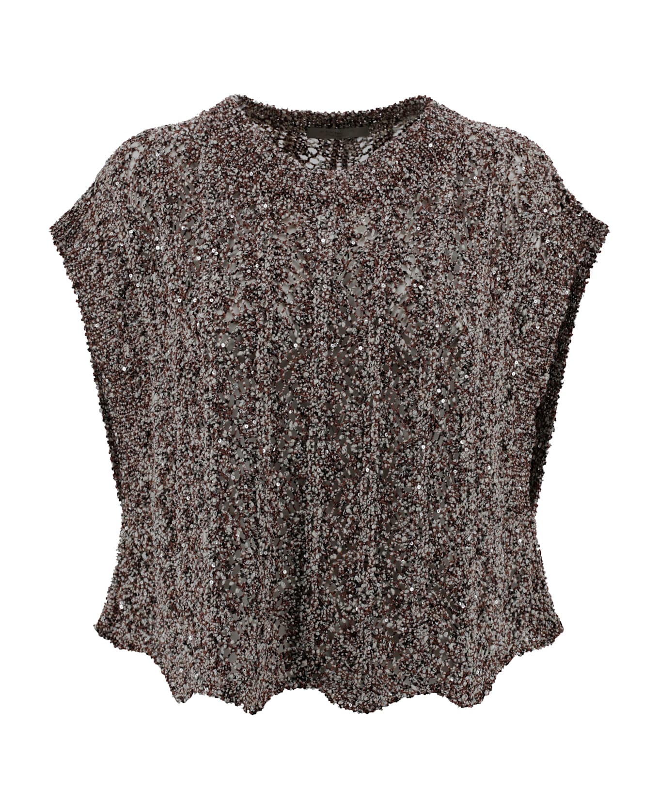 Paillette knit pullover with a crew neck, the model features a slightly raised ribbed crew neck, with a slightly dropped shoulder for a soft and modern effect, a wavy lower hem that adds movement and disrupts the linearity of the garment. Vertical ribbing throughout the length of the garment.