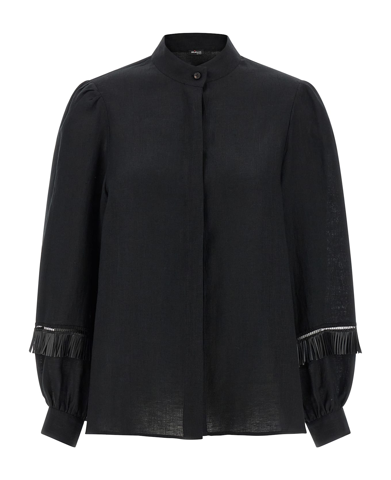 Linen shirt, loose fit, mandarin collar, front closure with hidden buttons, puff shoulder and wide sleeves with 'au jour' insert and fringes and cuffs with curl. Composition: 100% linen