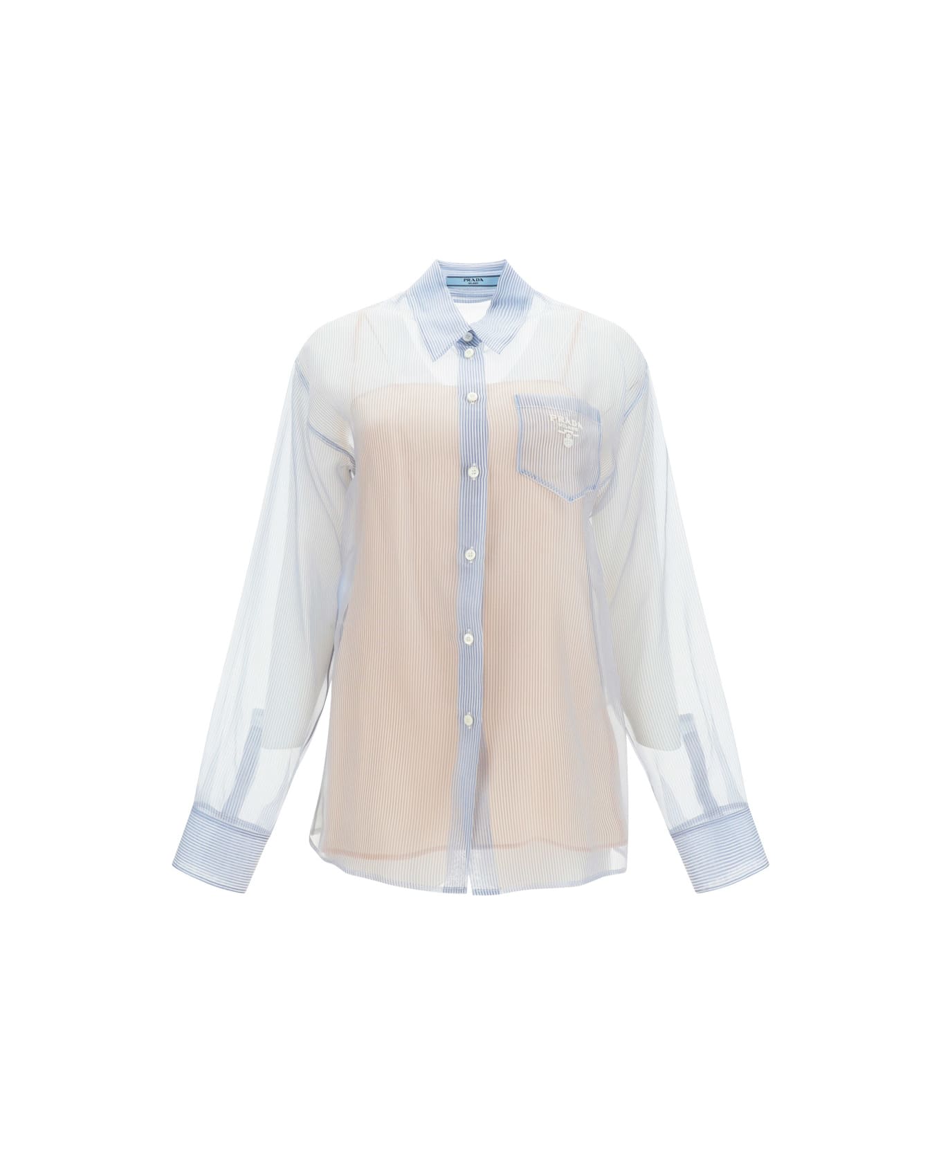 Silk shirt by prada, classic collar, front button fastening, one patch pocket on the front, iconic brand monogram embroidered in contrasting colour on the breast pocket, striped pattern, semi-transparent design, shirt with an embroidered camisole that serves as an opaque slip, adjustable cuffs with button fastening, oversized fit.