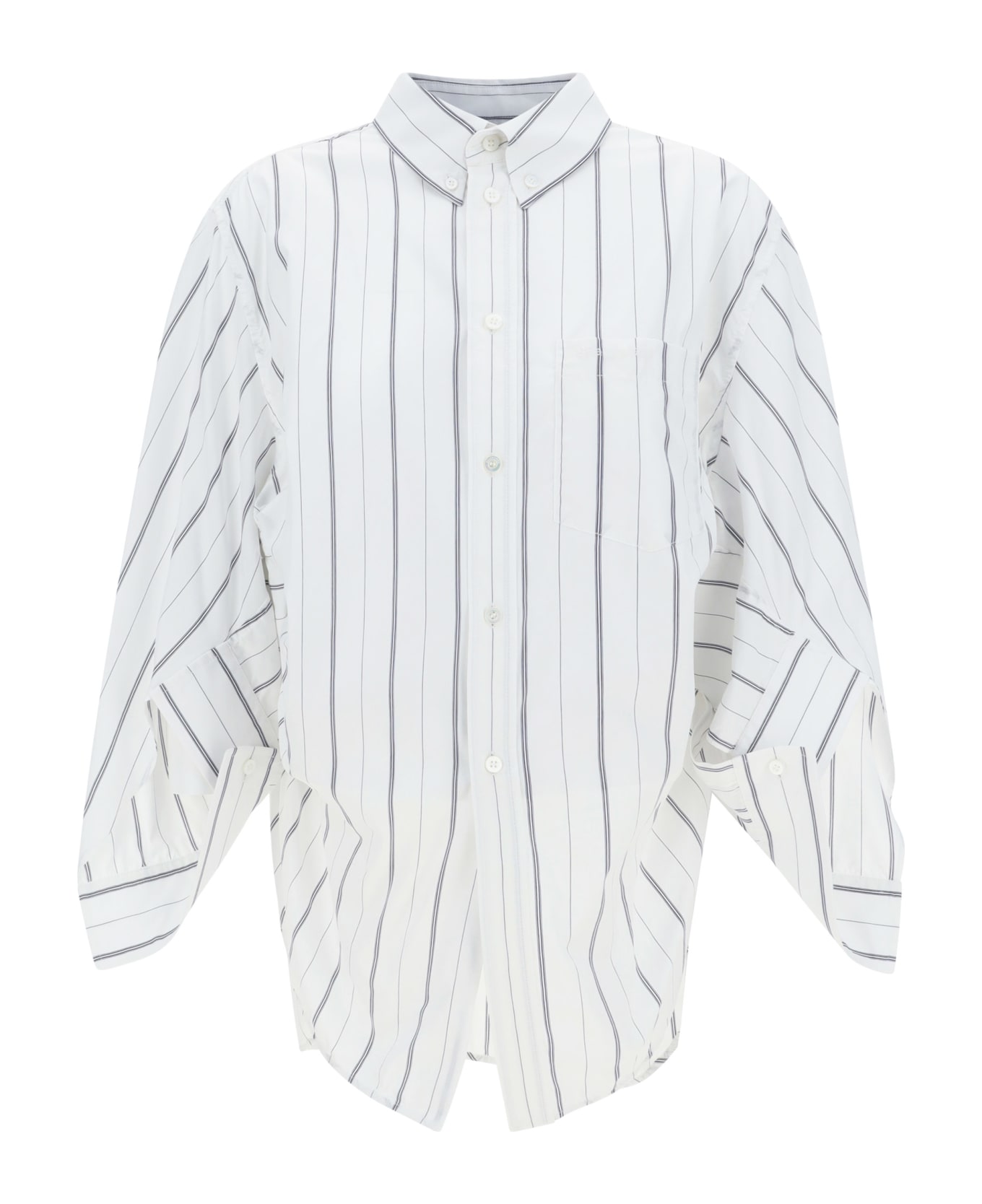 Cotton shirt by balenciaga, classic collar, front button closure, one pocket applied on the front with iconic tone-on-tone embroidered logo, wide sleeves with geometric cuffs, asymmetric hem with large side slits, contrasting stripe pattern, regular fit.