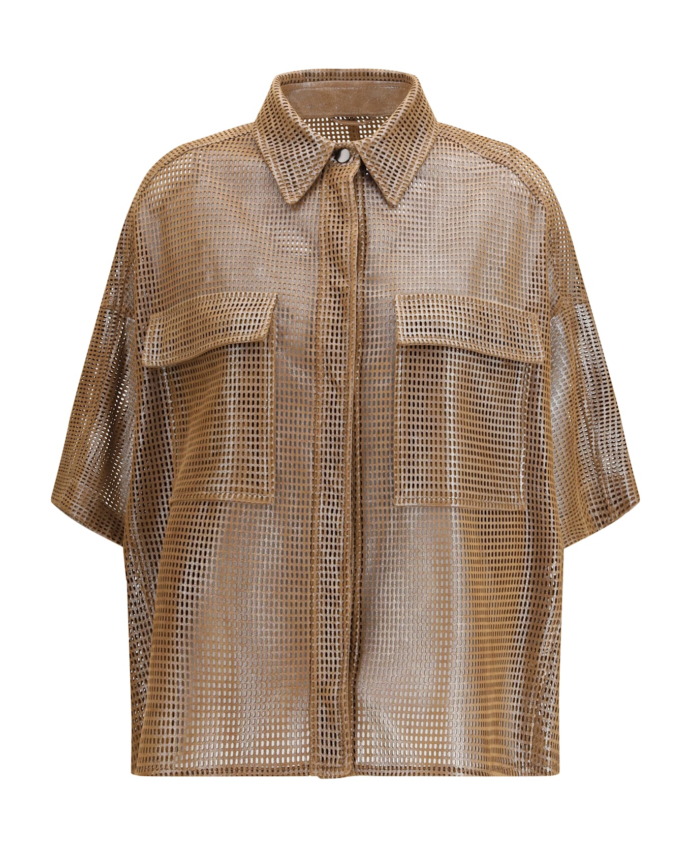 The sparkling net leather shirt by brunello cucinelli stands out for a lightweight construction that combines texture with a contemporary attitude. the sparkling net leather shirt model by brunello cucinelli is crafted in mesh leather with a metallic effect and features a classic collar with concealed snap button closure and a visible button at the neck. short sleeves with dropped shoulders and flap patch pockets on the chest define the structure of the garment. a back yoke, side slits and a straight hem slightly longer at the back complete the sparkling net leather shirt by brunello cucinelli with a relaxed fit.