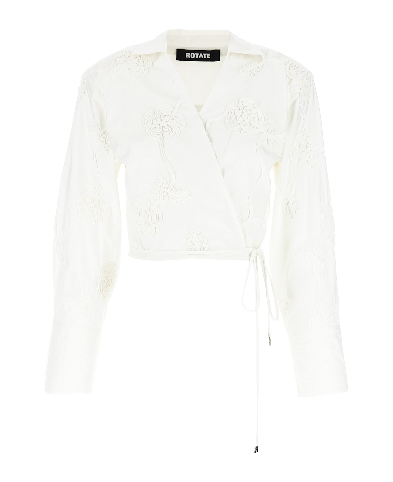 'Wrap Cotton' cotton shirt with all-over floral tonal embroidery, crop wallet style with lacing closure, V-neck with snap button, removable shoulder straps, long wide sleeves with cuffs.