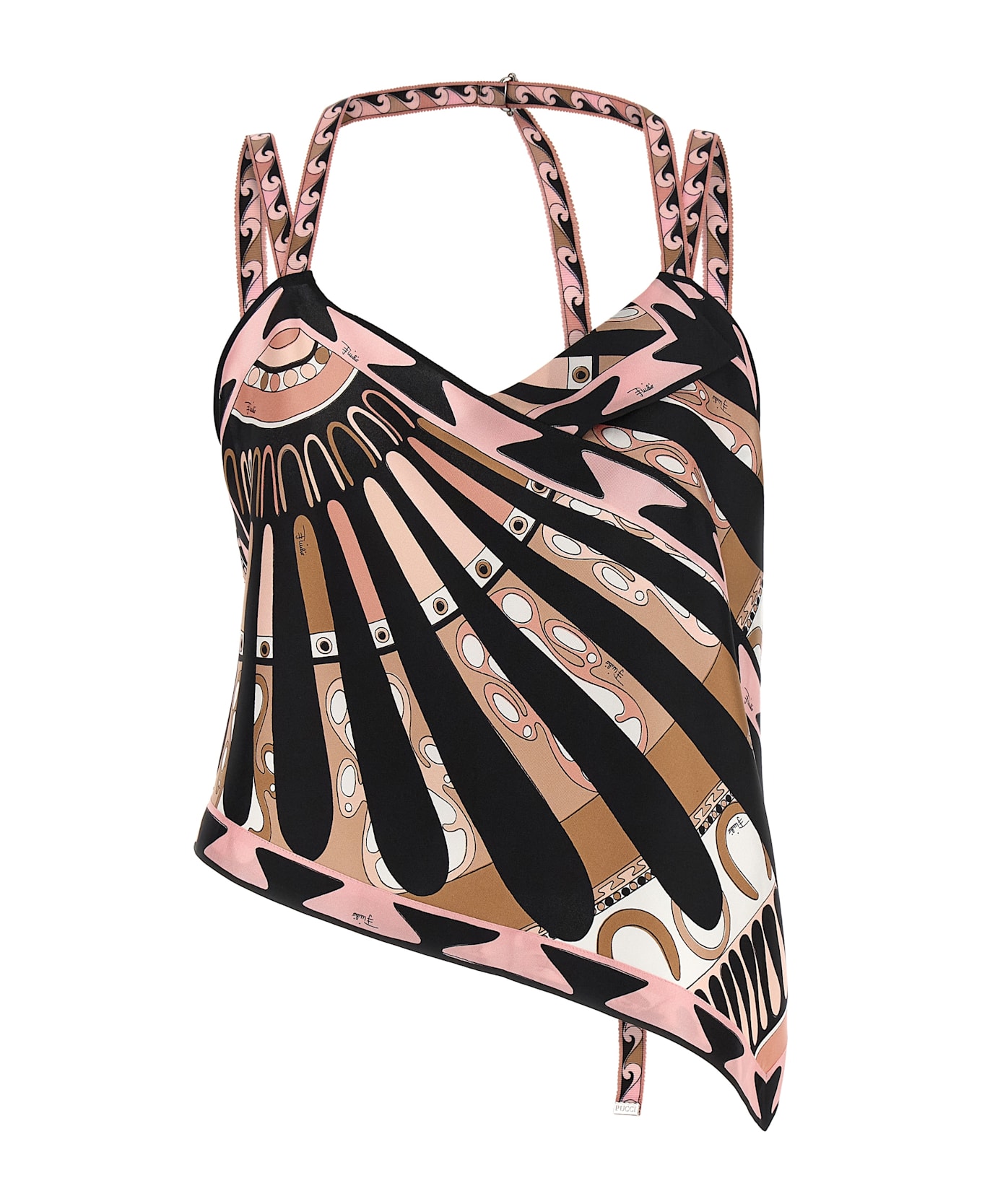 All over 'Soleil' print silk twill scarf top, crop model, tone-on-tone grosgrain shoulder straps, one of which to be adjusted behind the neck with metal buckle, front V-neck, asymmetrical hem. This product, like many other Pucci items, is made with an all-over print that falls differently on each garment The product shipped may differ from the one in the picture.