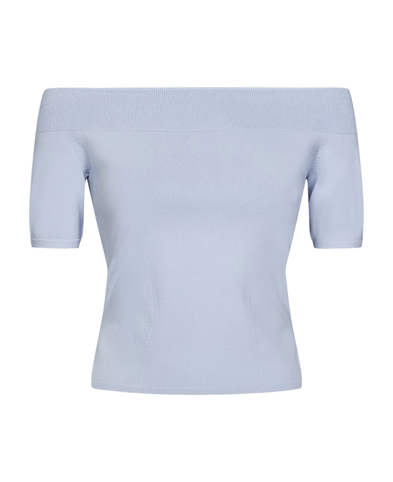 - Off-the-shoulder, ribbed neckline; Short sleeves