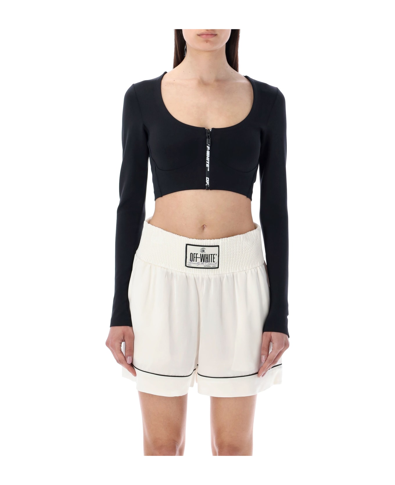 Stretch Zip Logo L/s Crop Top By Off-white. Featuring: Scoop Neck Zip Fastening At Front With Logo Detail Ribbed Side Panels Long Sleeves With Zipped Cuffs Crop Model Is 1,72 M Tall And She Is Wearing Size S