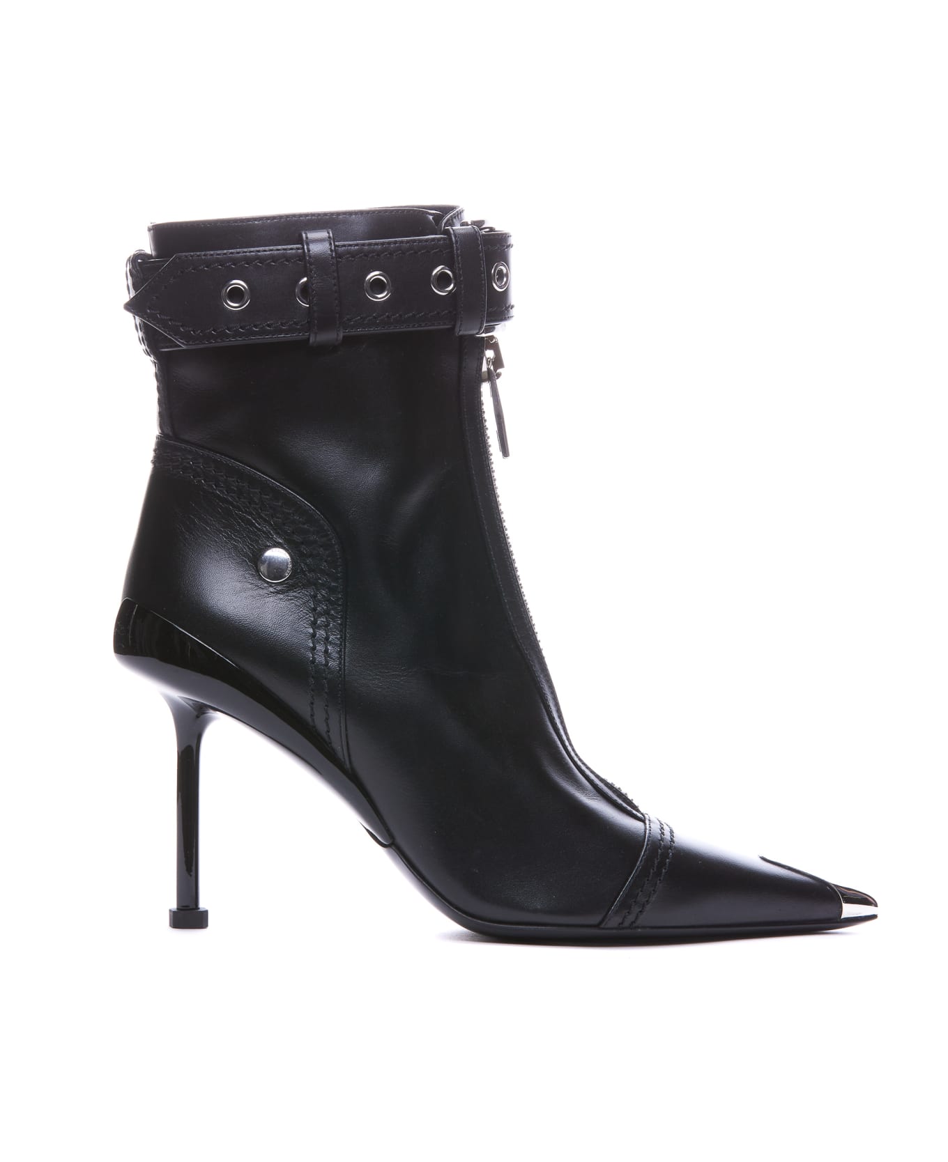 Alexander Mcqueen black pump booties, leather upper, strap with buckle detail, frontal zip detail, toe with metal detail, eu size