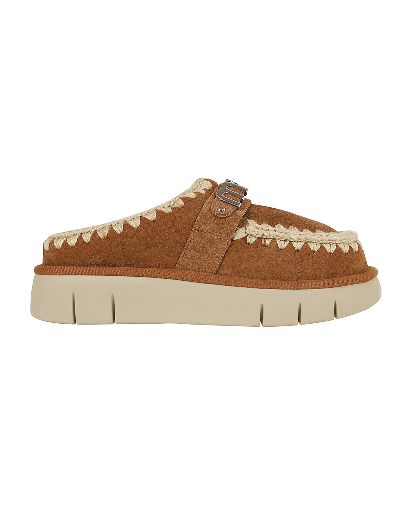 Bounce clog metal logo calf leather suede silver-tone logo lettering round toe slip-on style chunky rubber sole