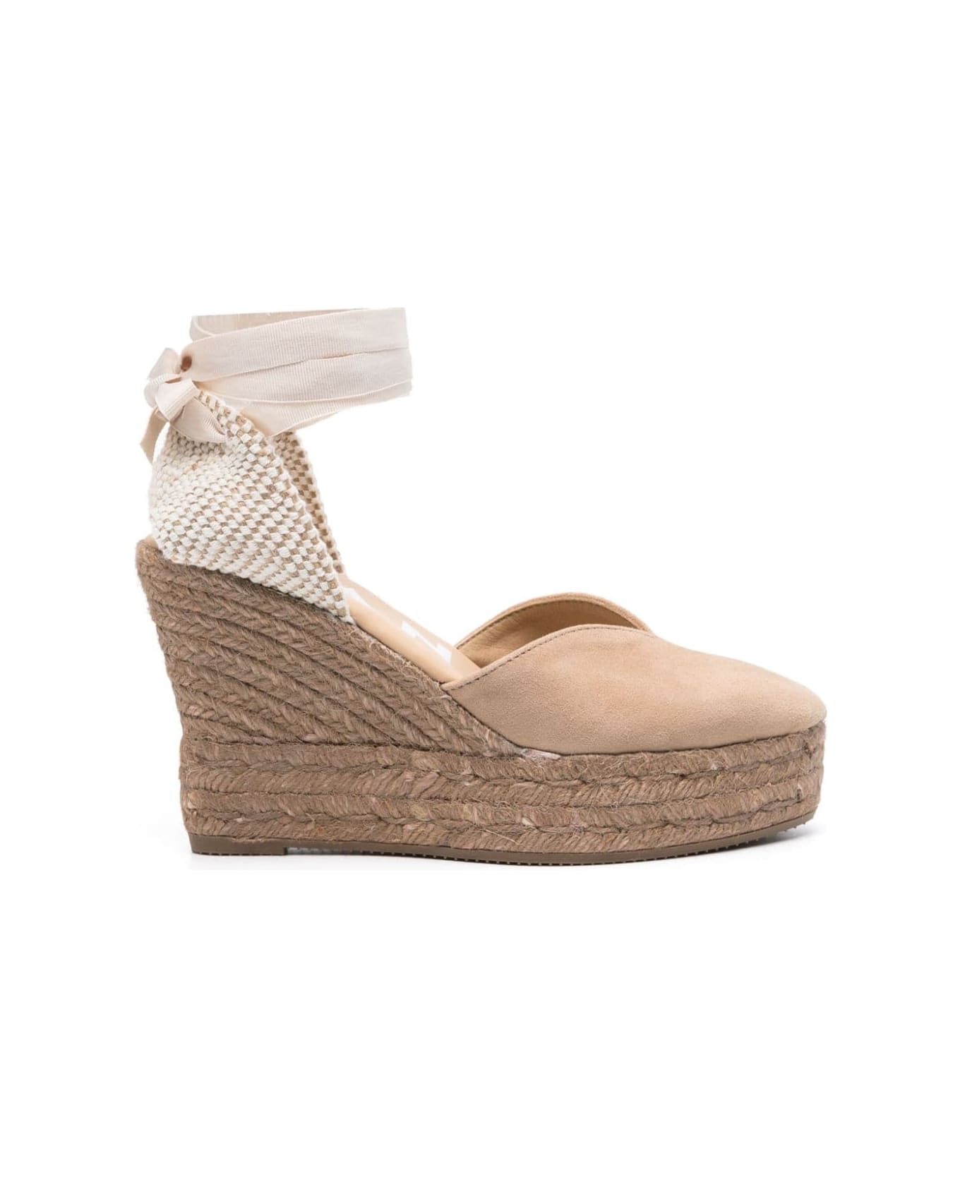 taupe brown calf suede round toe branded leather insole 110mm braided raffia wedge heel rubber sole tie-fastening ankle strap