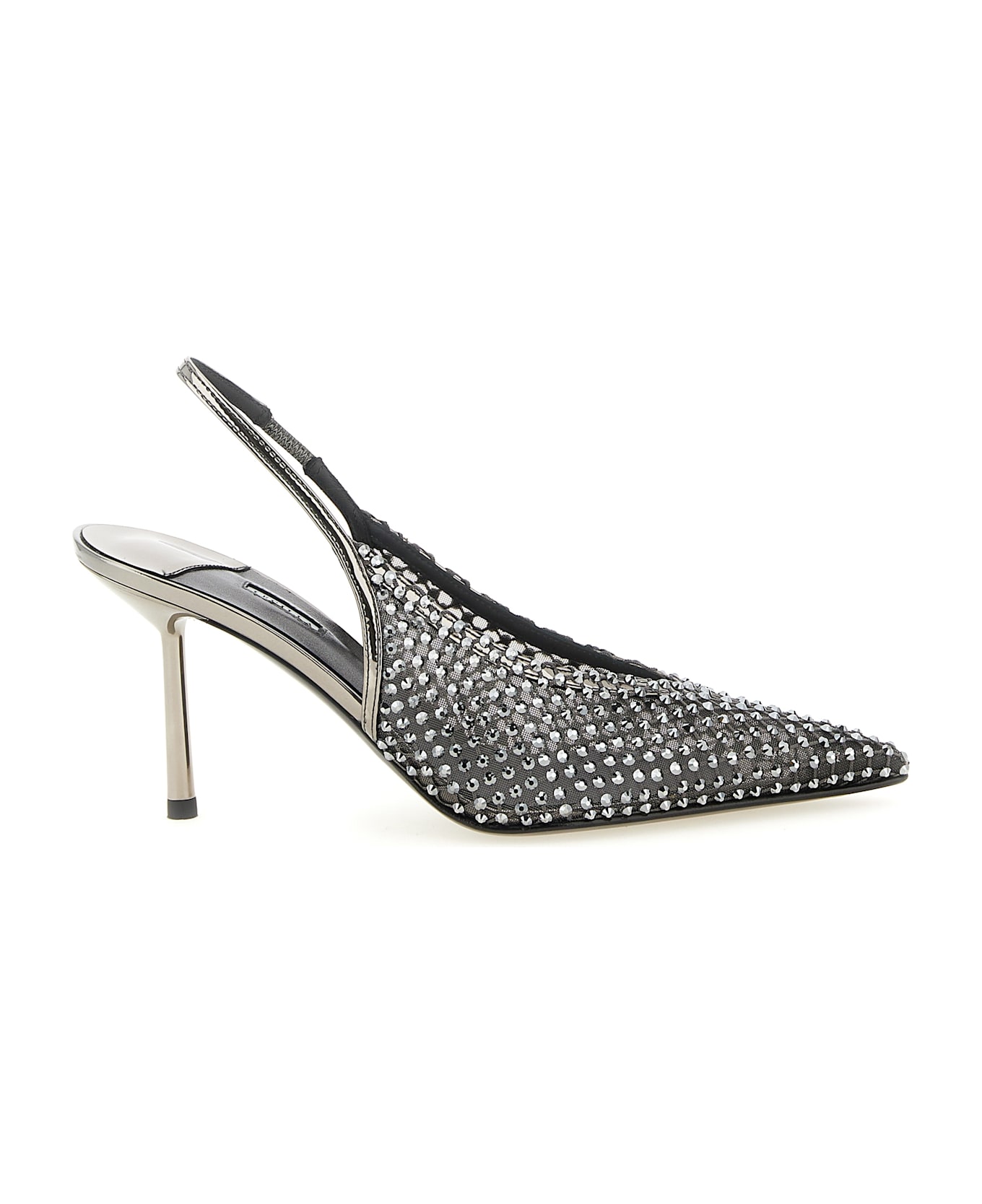 'Gilda' semi-transparent mesh slingbacks with all-over crystal application and tone-on-tone cotton canvas, silver 'Eclissi' upper, pointed toe, elastic strap, stiletto heel, leather sole with non-slip central rubber.