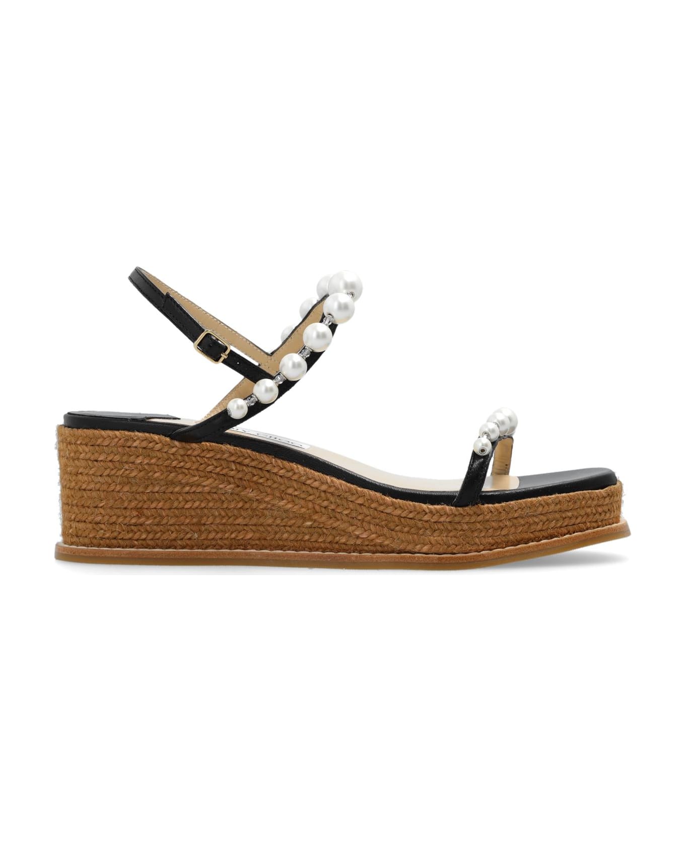 Black 'Amatuus' wedge sandals from Jimmy Choo. Made of leather, this model sits on a woven jute sole with a beige rubber trim and features an adjustable ankle strap with a buckle and pearly applications.