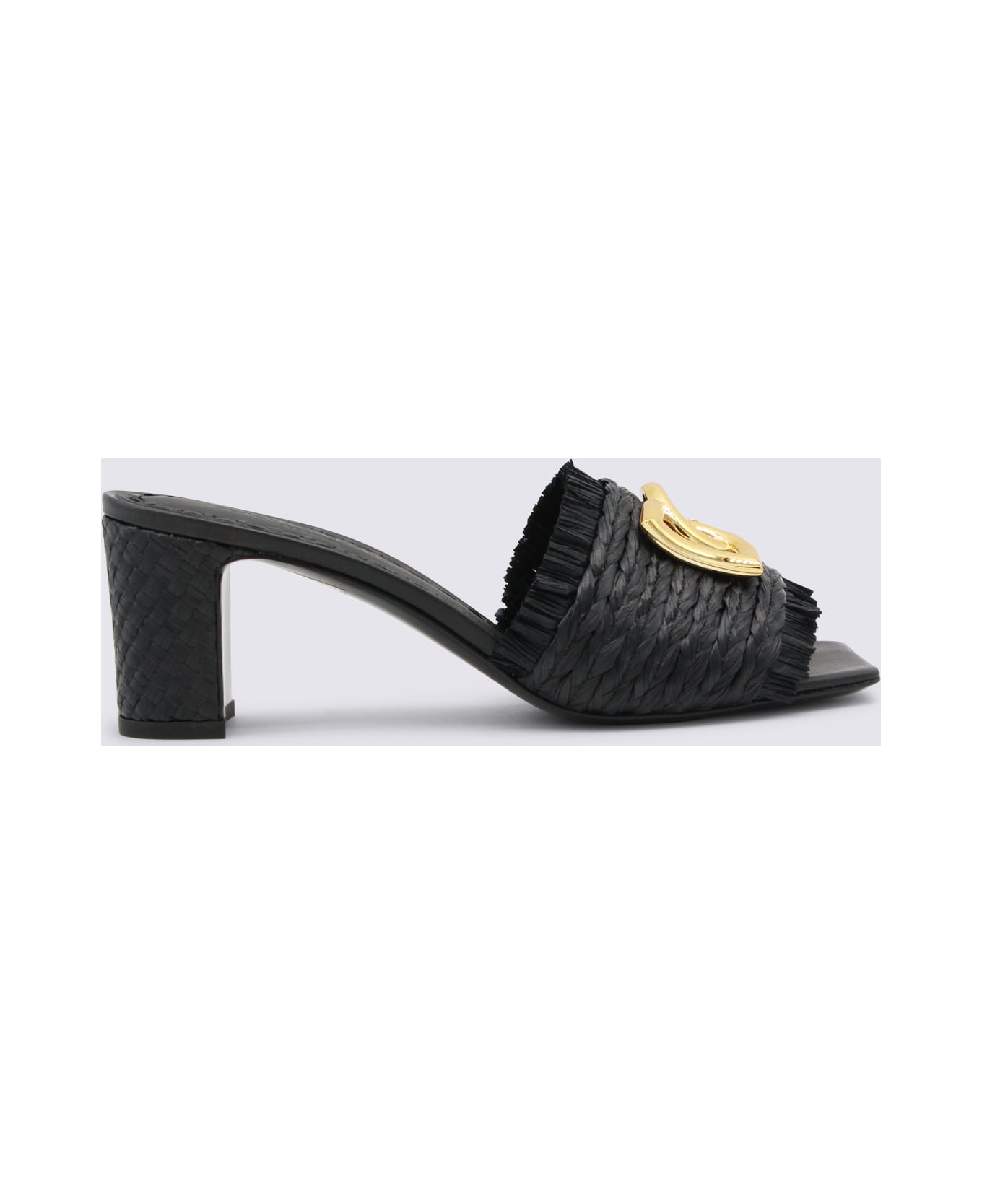 Black leather sandals from Dolce & Gabbana featuring open square toe, slip-on style, gold metal logo and block heel.