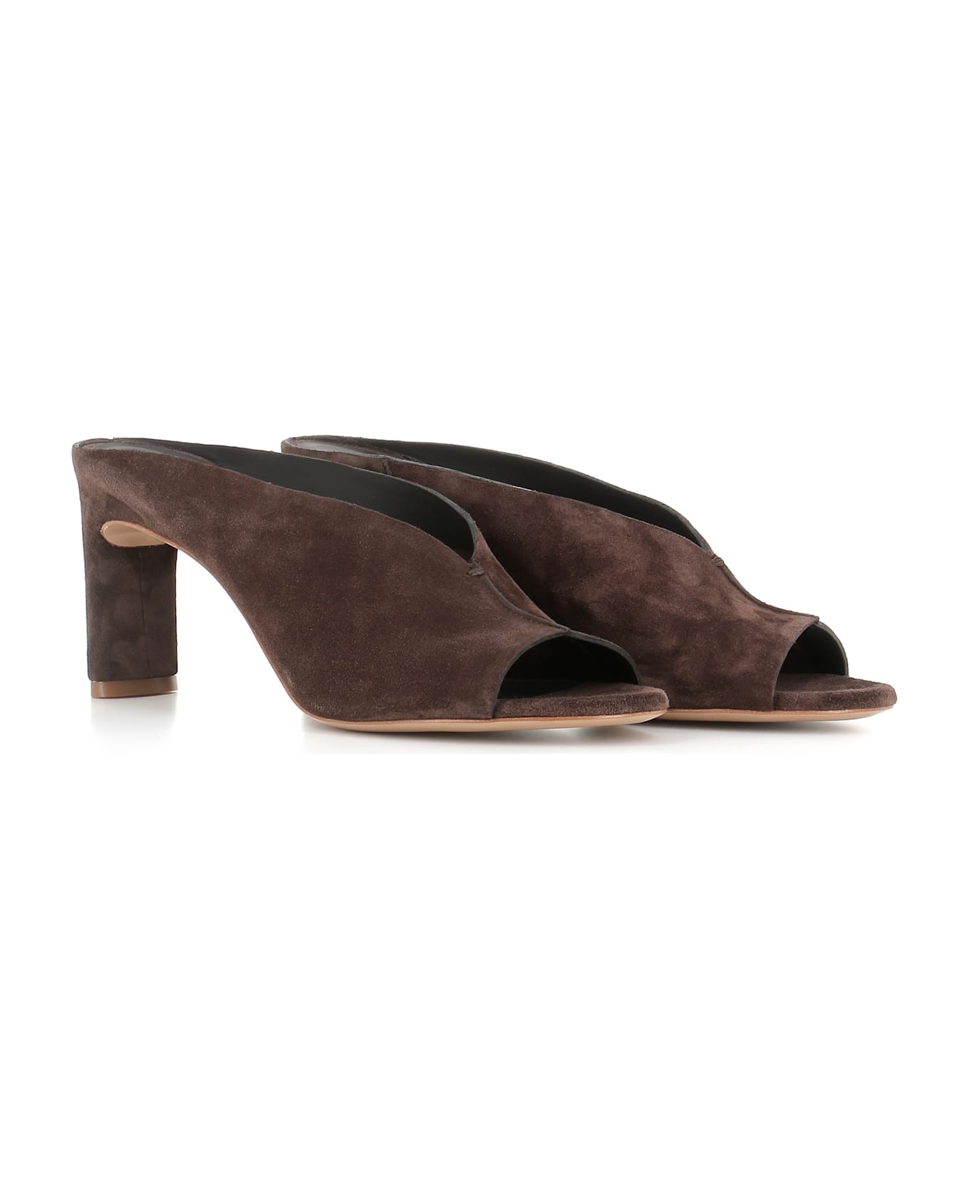Dark brown woman soft suede Mule by Del Carlo, featuring by an open toe and a 'V' front cut. Unlined interior. Leather sole. Round heel: 8,5 cm