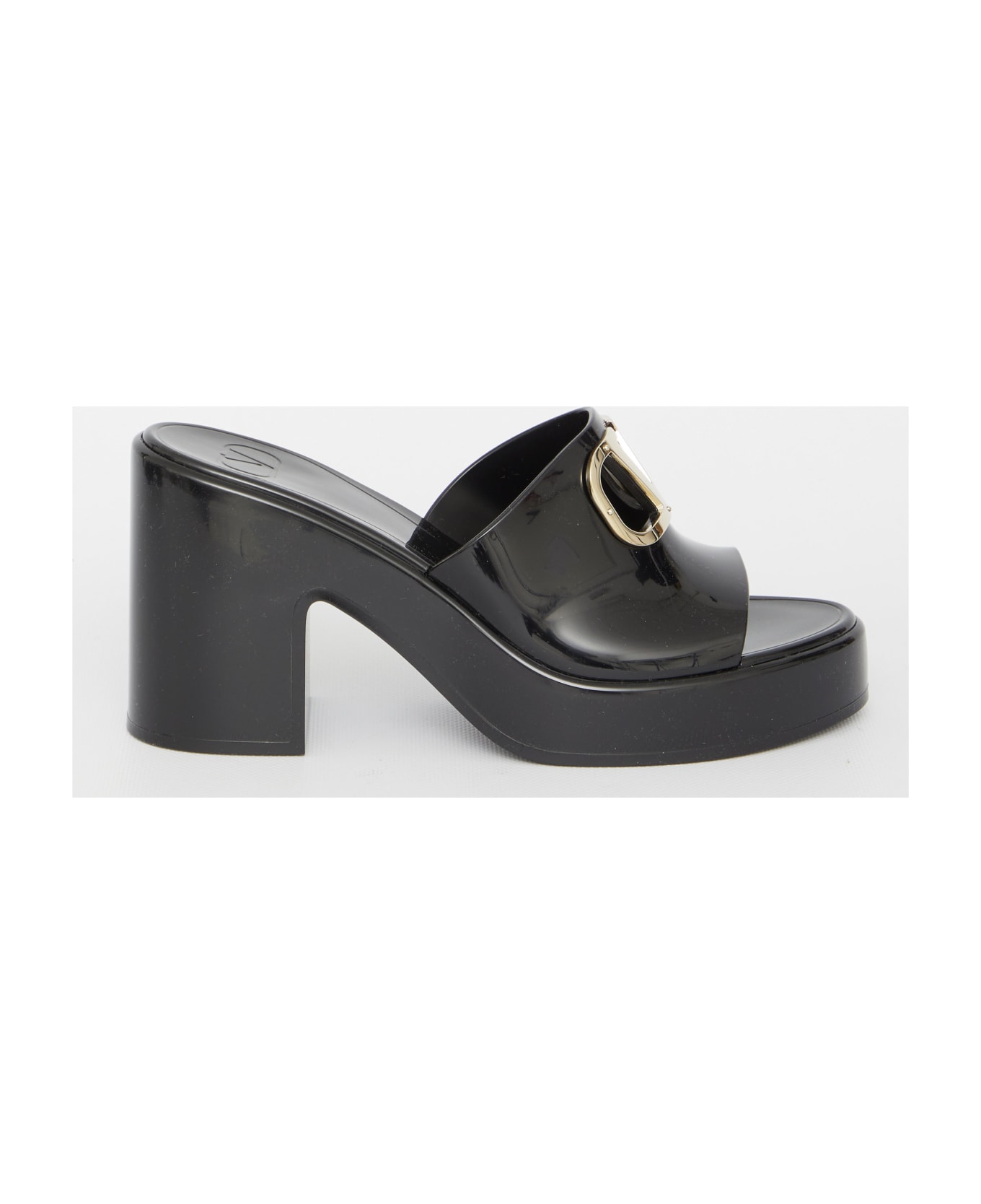 Valentino Garavani VLogo Type sandals in black rubber with platinum-finish metal VLogo Signature detail. They feature open toe, embossed VLogo Signature on the insole and block heel. Rubber sole.