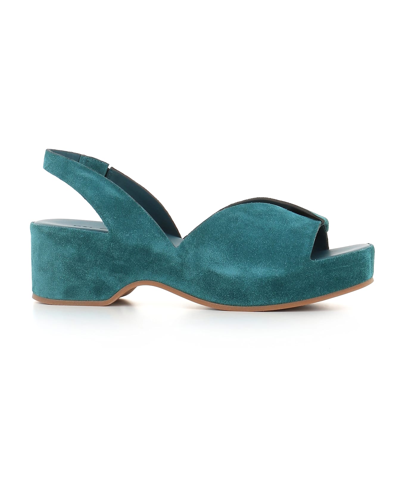 Petrol green woman suede Wedge by Del Carlo, featuring by criss-crossed raw cut front bands and elasticated back band. Lined interior. Fund covered in leather. Heel: 5,5 cm