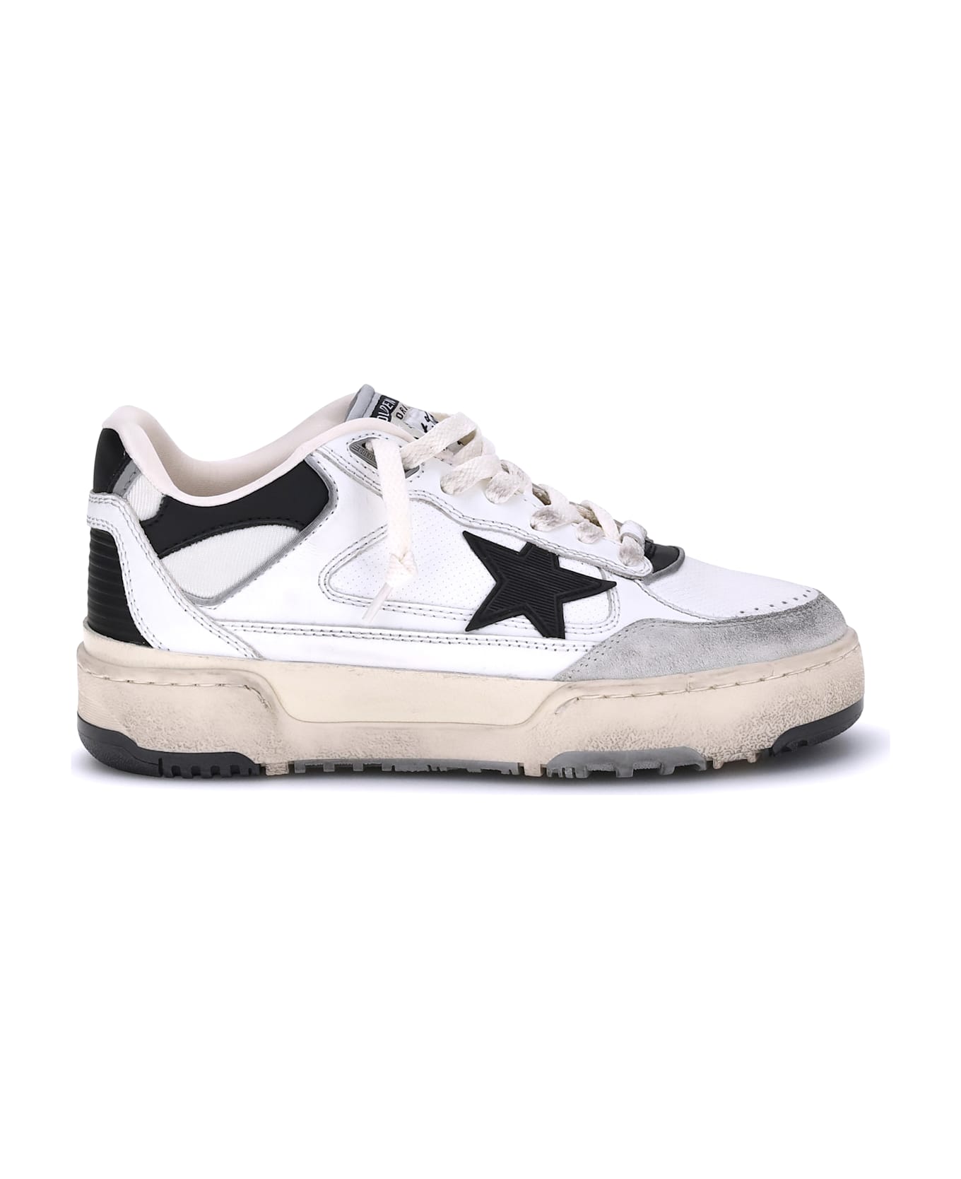 The golden goose forty2 sneakers are inspired by the glory days of american basketball, reinterpreted with a contemporary aesthetic and exceptional artisanal construction. the chunky low-top silhouette features micro-perforated inserts and 3d textured effect details, such as the black tpu star and the black leather back insert. the design is completed by the coordinated heel tab, the grey piping, the ice grey suede toe and the white laces with a vintage effect, for a bold and sophisticated look.