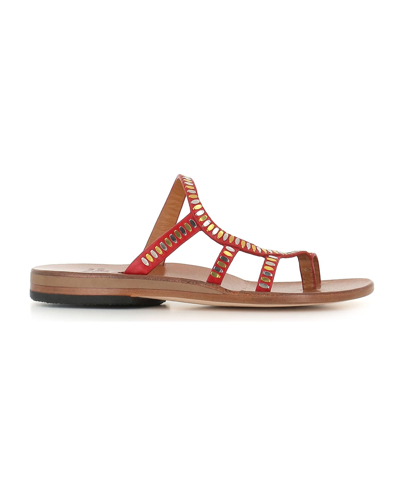 Red leather woman's Mule by Calleen Cordero, embellished with nickel details. Leather sole. Artisan manufacturing. Handcrafted in N. Hollywood, CA. Heel: 2 cm
