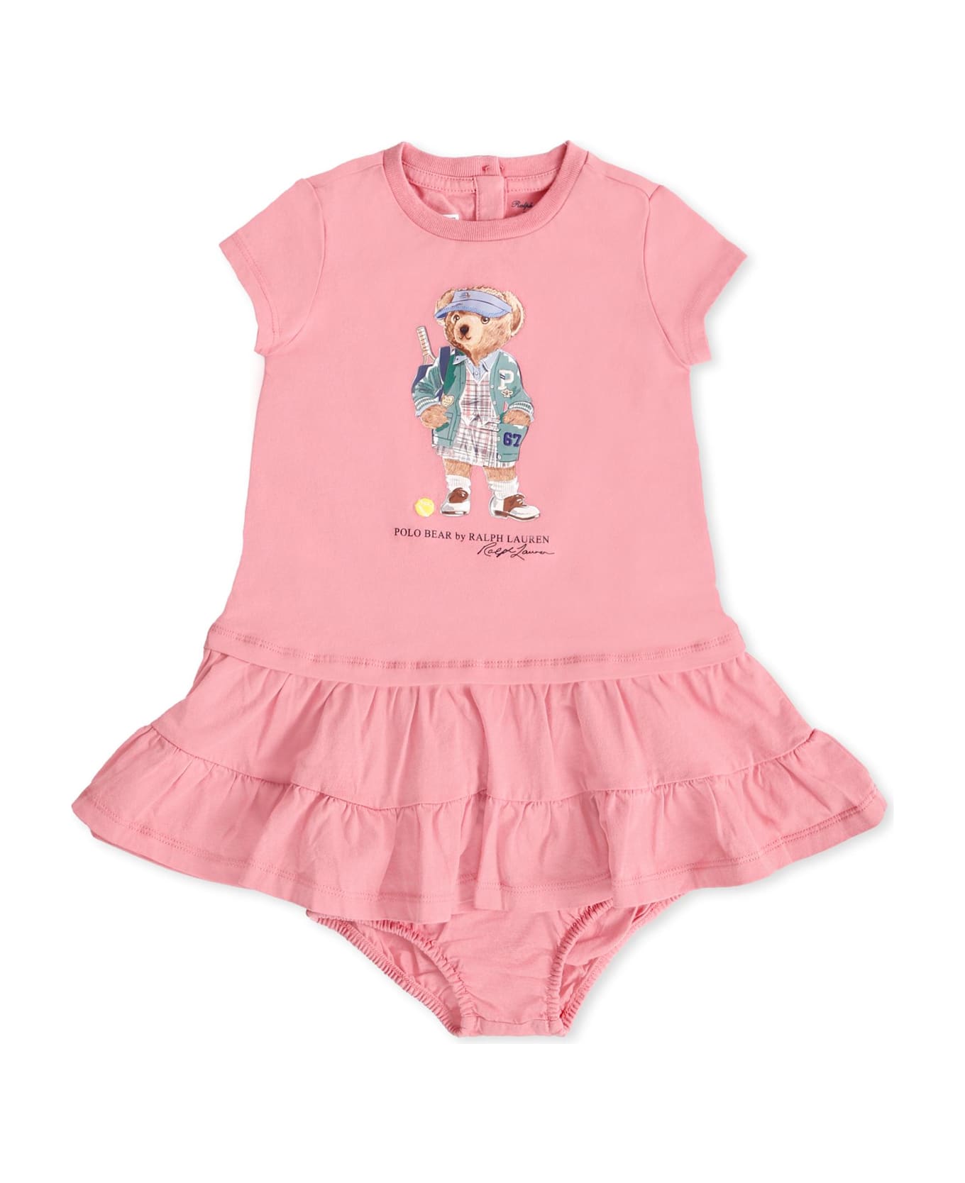 Pink cotton dress, short sleeves, with ribbed crew neck, button fastening on the back, flounce at the bottom and culottes with elasticated waist. It is embellished with Polo Bear print on the front.