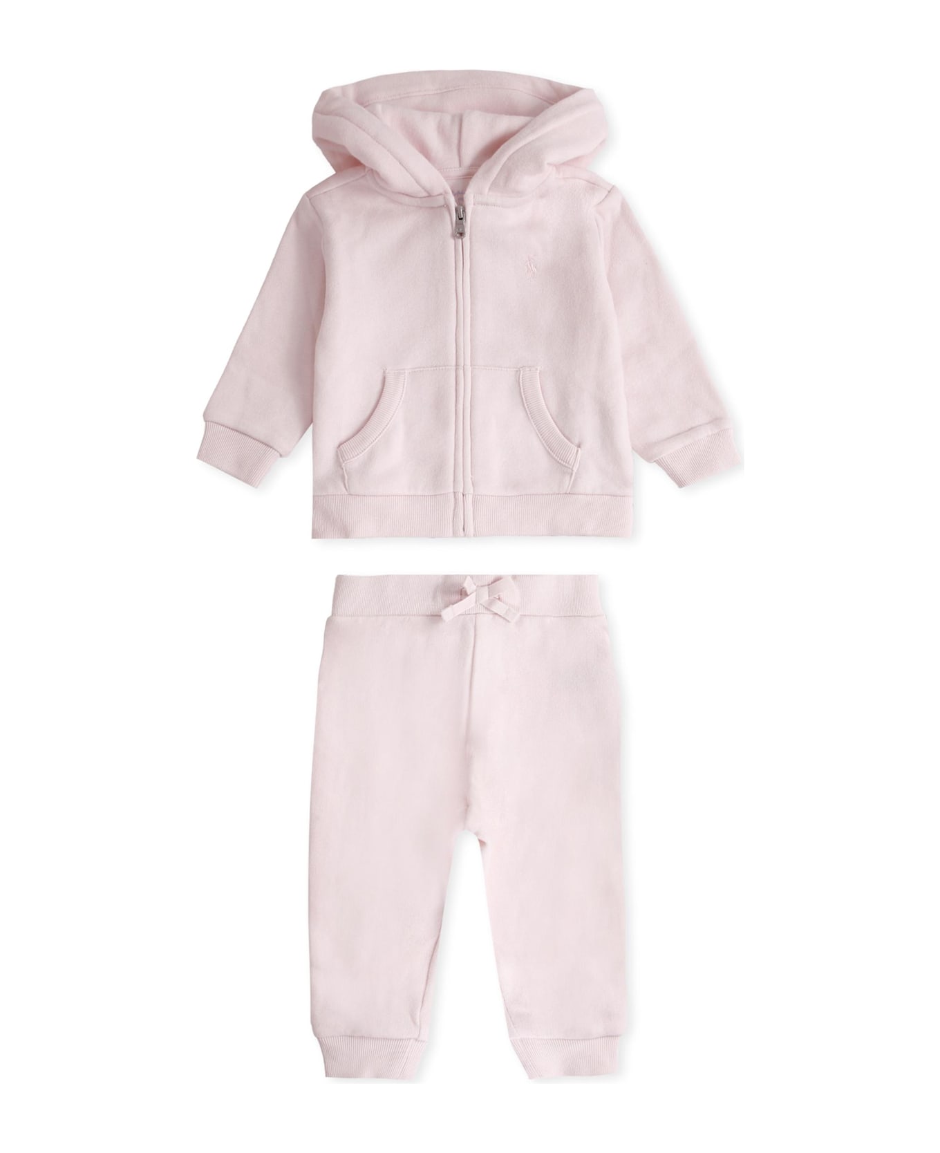 Pink cotton fleece suit, composed of sweatshirt and trousers. Long-sleeved sweatshirt, with long sleeves, hood, front zip fastening, side pockets, ribbed cuffs and hem. It is embellished with iconic horse embroidered on the chest. Trousers with elasticated waist, front bow and ribbed ankles.