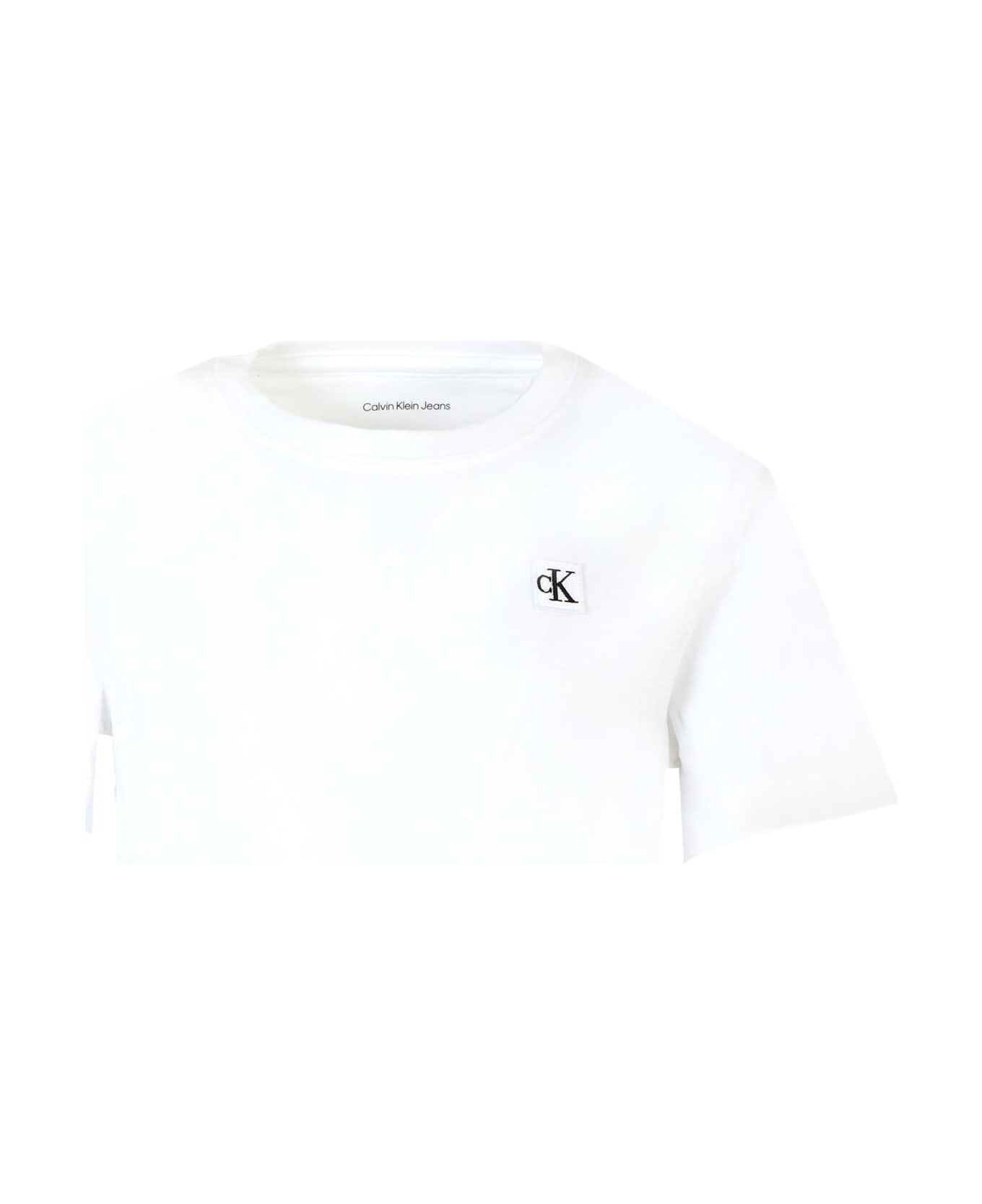 White cotton t-shirt with short sleeves and a ribbed crew neck. It is embellished with an embroidered logo patch on the chest.