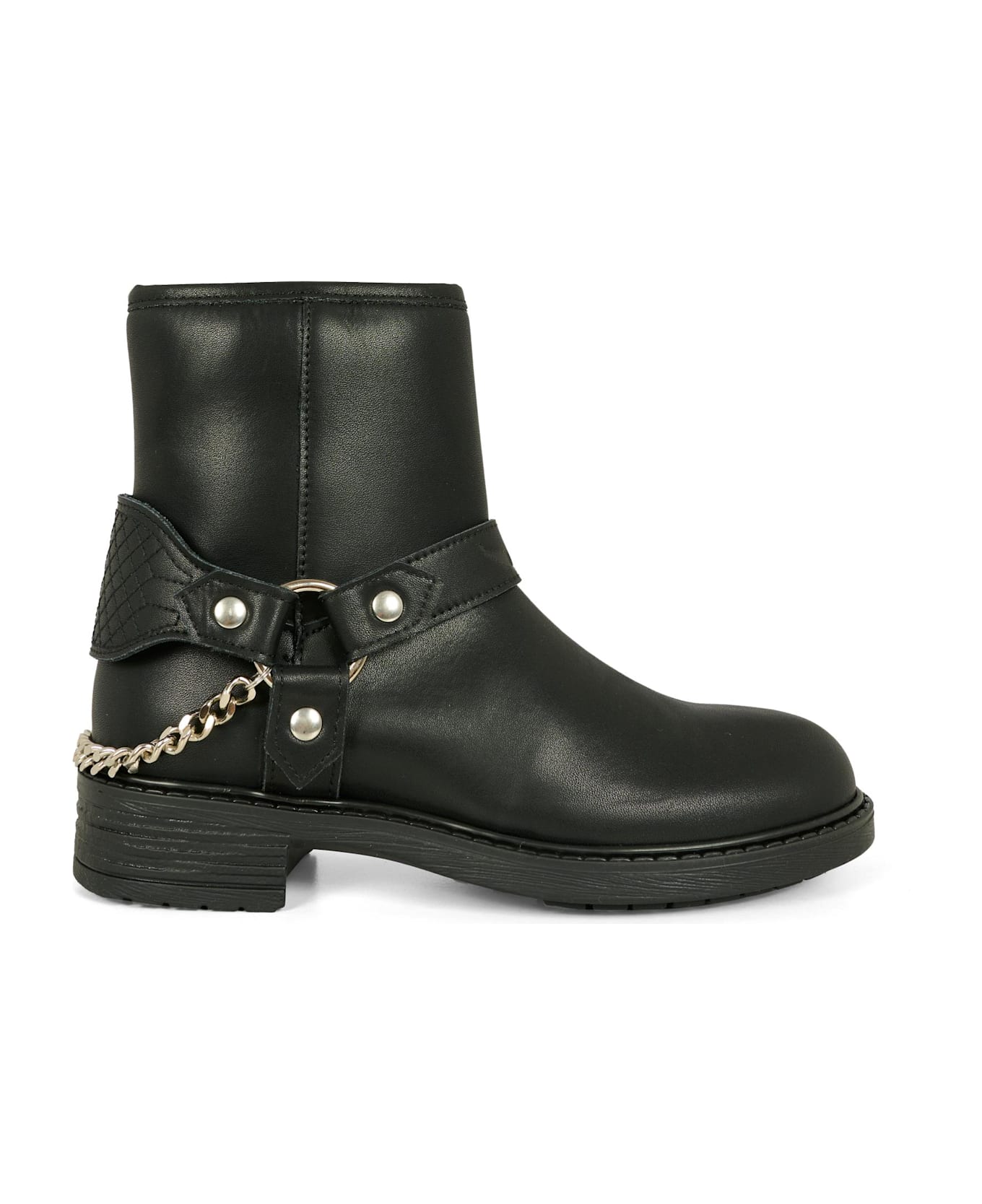 Black leather ankle boots with rubber soles, a side zip, and a chain detail on the back. They are embellished with wings on the front.