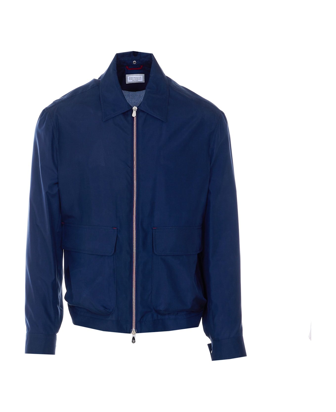 Brunello Cucinelli blue jacket with frontal zip closure, regular collar, pockets on the front with buttons, button on cuffs