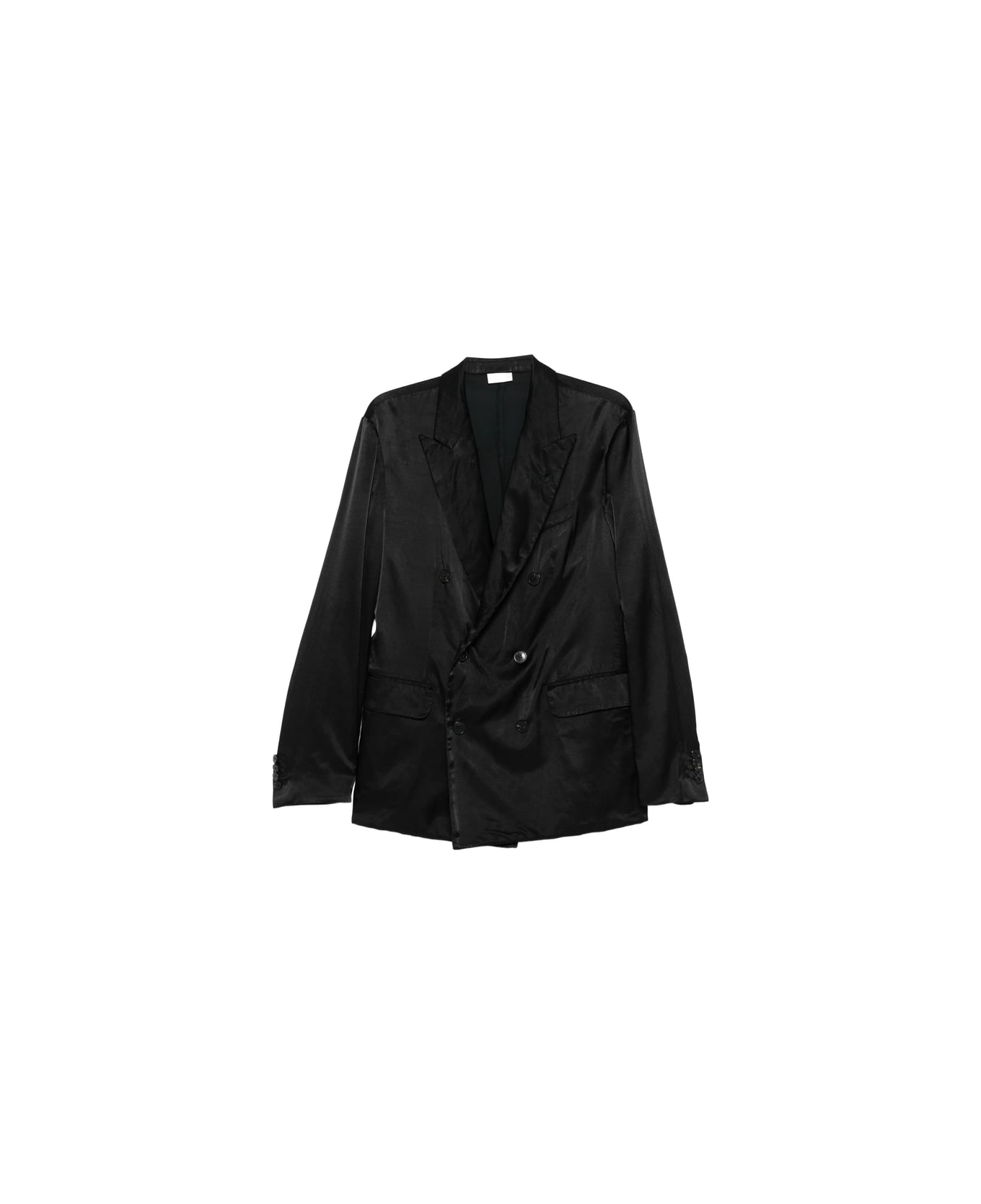 black double-breasted peak lapels button fastening flap pockets buttoned cuffs