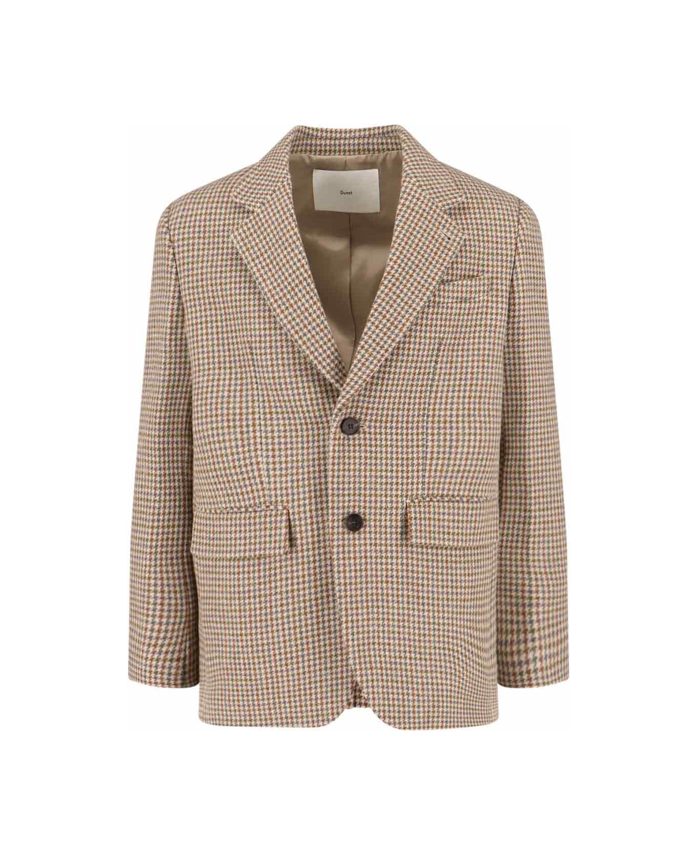 Single-breasted blazer in Dunst wool blend, beige, contrast houndstooth pattern, classic lapels, button closure, chest pocket, two front pockets, brown suede patch on the back sleeve, button cuffs, straight hem.