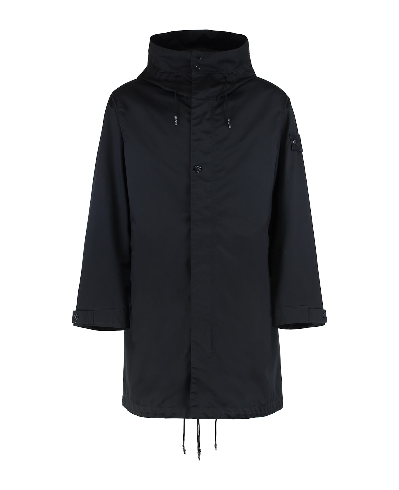 Wool twill parka with hood and weather-resistant resin lining. the design features a front closure with zipper and automatic buttons, a loose fit that guarantees comfort and freedom of movement. the sleeves are raglan, adding a touch of casual style. includes an adjustable drawstring at the bottom for a customized fit. removable logo patch on the left sleeve.