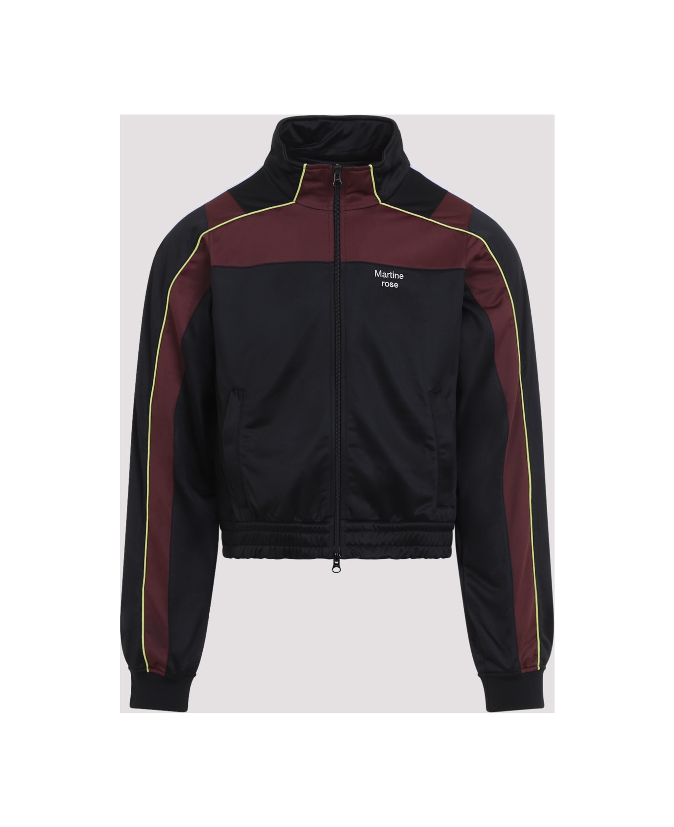 Martine Rose Shrunken Black Polyester Jacket. Crafted from black and burgundy tech fabric, featuring a contrasting piping on the front, a stand collar, two-way zip fastening, a logo embroidery on the chest, two front pockets, long sleeves, and elastic edges.