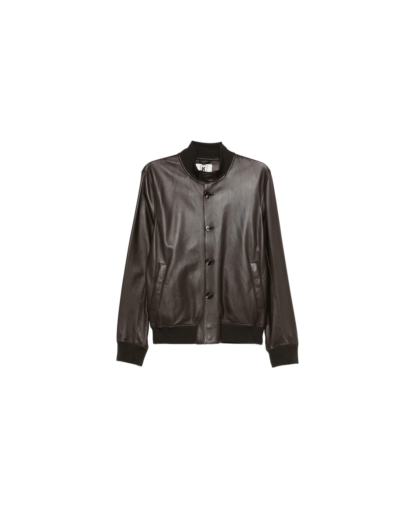brown button fastening ribbed hem and cuffs leather welt pockets