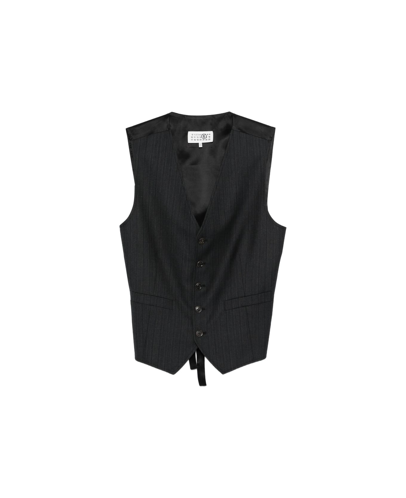 dark grey pinstripe design V-neck button fastening front welt pockets sleeveless
