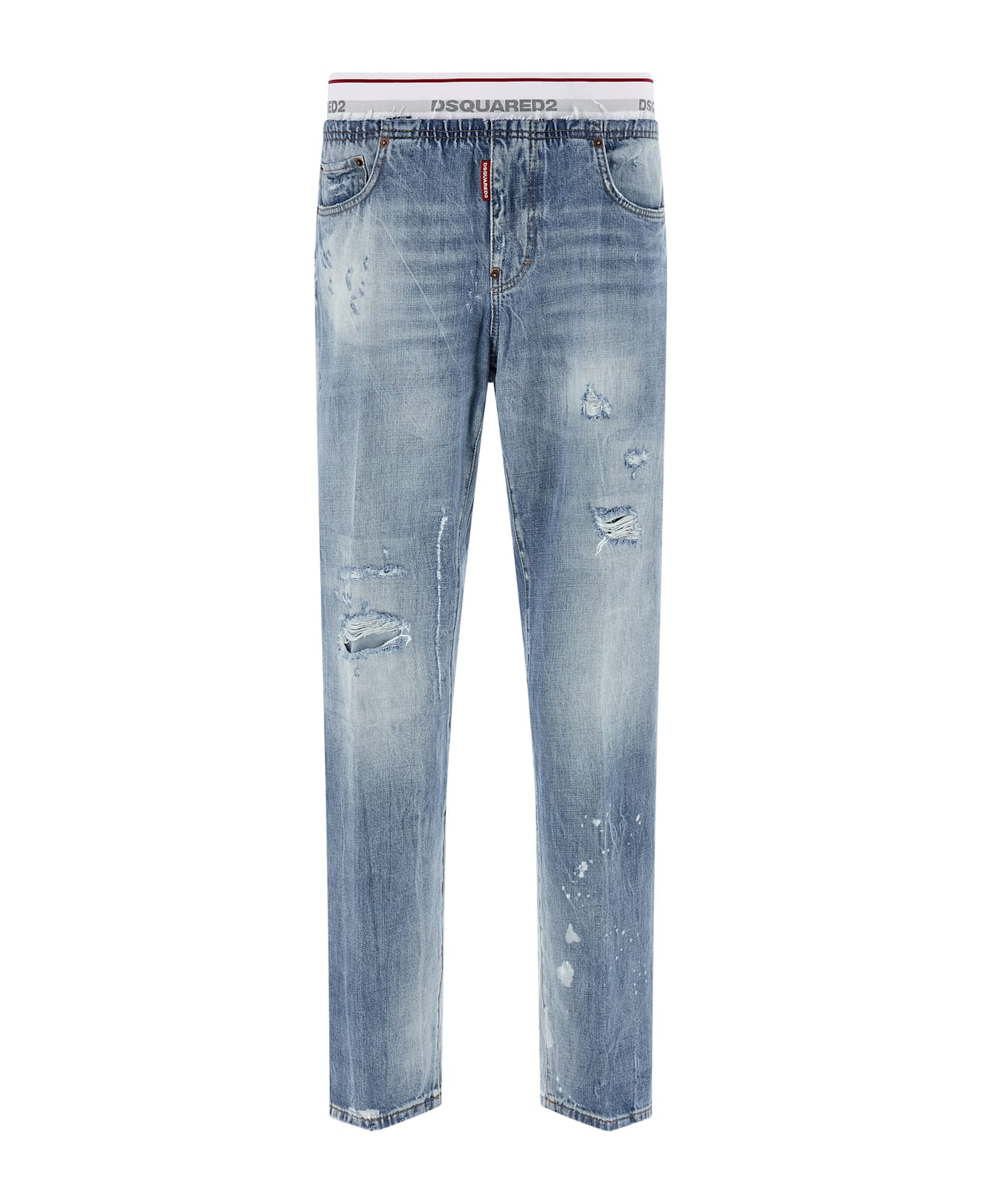'Denim Jogger' 13. 5 oz stone washed stretch cotton denim jeans with destroyed details, contrast stitching, elastic insert with jacquard logo at the waist, pull-on model, trompe l'oeil flap, five pockets.