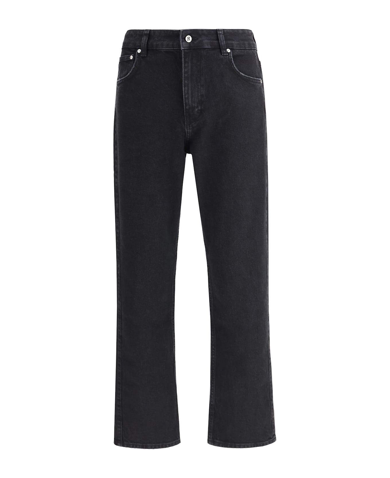 The r2 straight leg jeans by represent are crafted from faded denim featuring a worn-in effect with subtle distressing on the thighs. they have a mid-rise waist, concealed zip and button closure, belt loops, and a five-pocket design. a logo plaque and rear logo detailing complete the piece, adding a refined touch to represent s modern and effortless aesthetic.