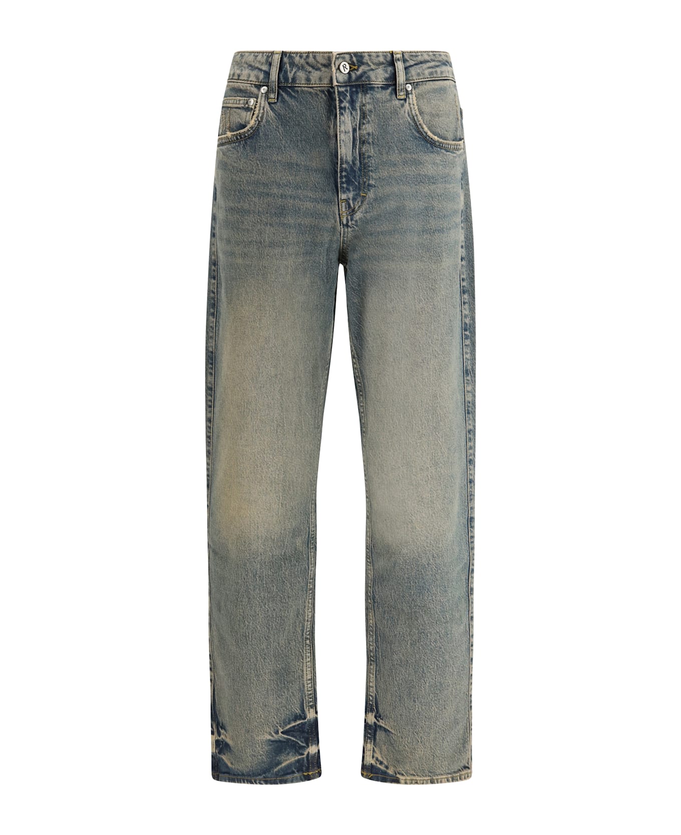 The r2 straight leg jeans by represent are crafted from faded denim featuring a worn-in effect with subtle distressing on the thighs. they have a mid-rise waist, concealed zip and button closure, belt loops, and a five-pocket design. a logo plaque and rear logo detailing complete the piece, adding a refined touch to represent s modern and effortless aesthetic.