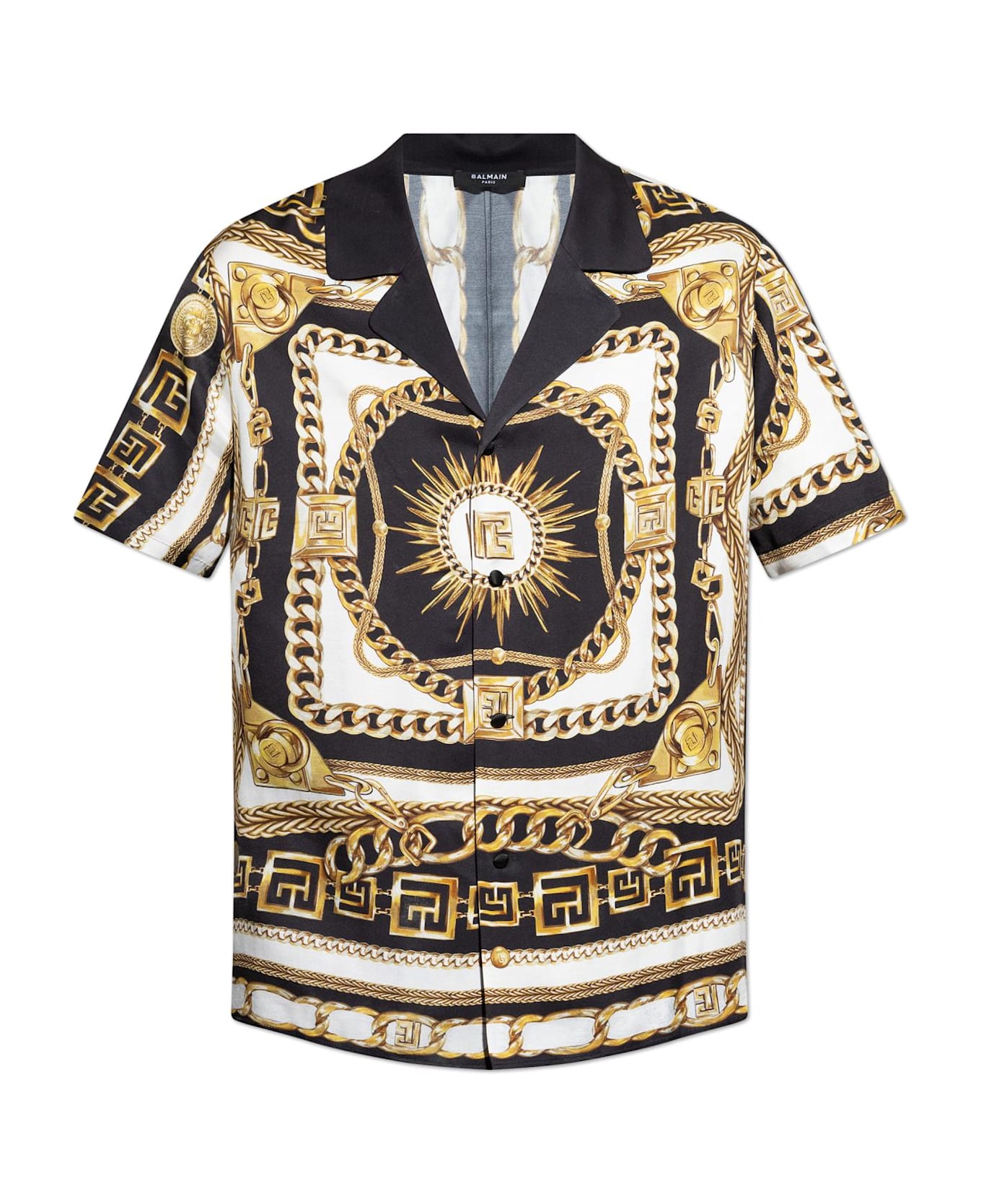 Immerse yourself in the artistry of Balmain with this extraordinary Logo Shirt for men, a true celebration of contemporary opulence. Crafted from luxuriously smooth viscose, this shirt showcases a classic, relaxed silhouette with short sleeves and refined front button closure. The distinctive camp collar lends effortless sophistication, setting a new standard for elevated casual wear. Its striking baroque-inspired motif captivates at once rich geometric patterns, inventive chain accents, and ornate gold details come together harmoniously on a dramatic black, white, and gold canvas. At the center, a radiant three-dimensional designer logo serves as the unmistakable focal point, surrounded by intricate Greek key borders and regal medallions, imparting undeniable exclusivity. Why choose this product? Signature Balmain design timeless yet exuberant Expertly tailored from premium viscose for optimal comfort Dramatic, universally flattering fit for versatile styling Unmistakable luxury with exquisite baroque detailing Symbol of prestige and contemporary boldness