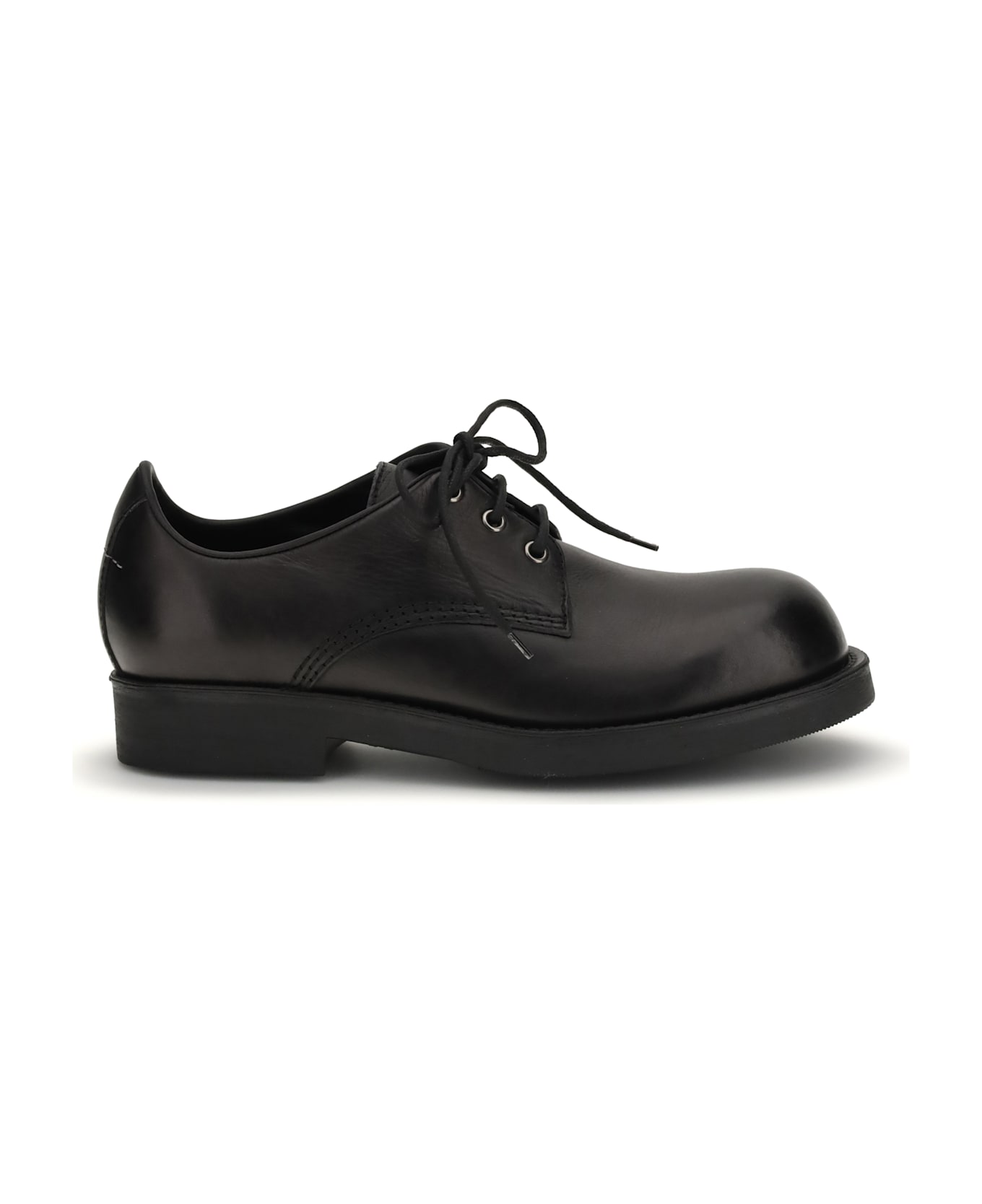 The biker lace-up shoes by mm6, made of calfskin leather, combine ruggedness and urban style. the structured silhouette, supported by a durable sole, recalls typical biker details, reinterpreted in a contemporary key. finished with mm6's iconic white topstitching and featuring a lace-up closure, they offer character and practicality for any occasion.