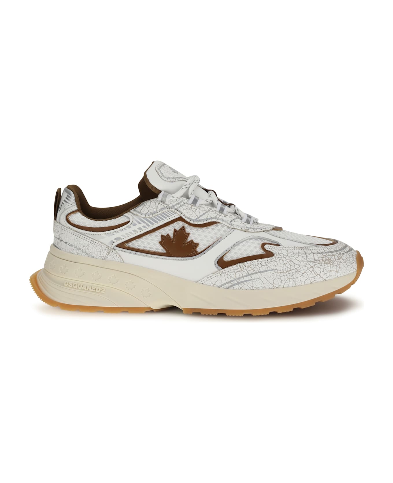 The sprinter sneakers by dsquared2 combine technical materials and a modern design. crafted from mesh and cracked leather, they are enriched with reflective details for greater visibility. the trekking-style laces emphasize the sporty spirit, while the maple leaf on the side recalls the brand's canadian identity. the rubber running sole ensures comfort and grip, completed by the dsquared2 patch on the tongue for a distinctive and recognizable touch.