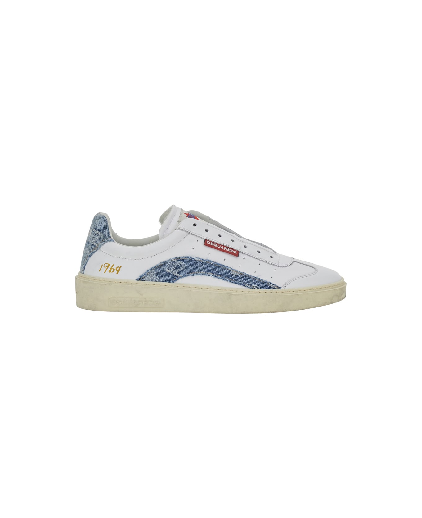 Sneakers White Low top Round toe Front lace-up closure Logo patch on the tongue Logo lettering on the rear Denim panels Distressed effect Leather