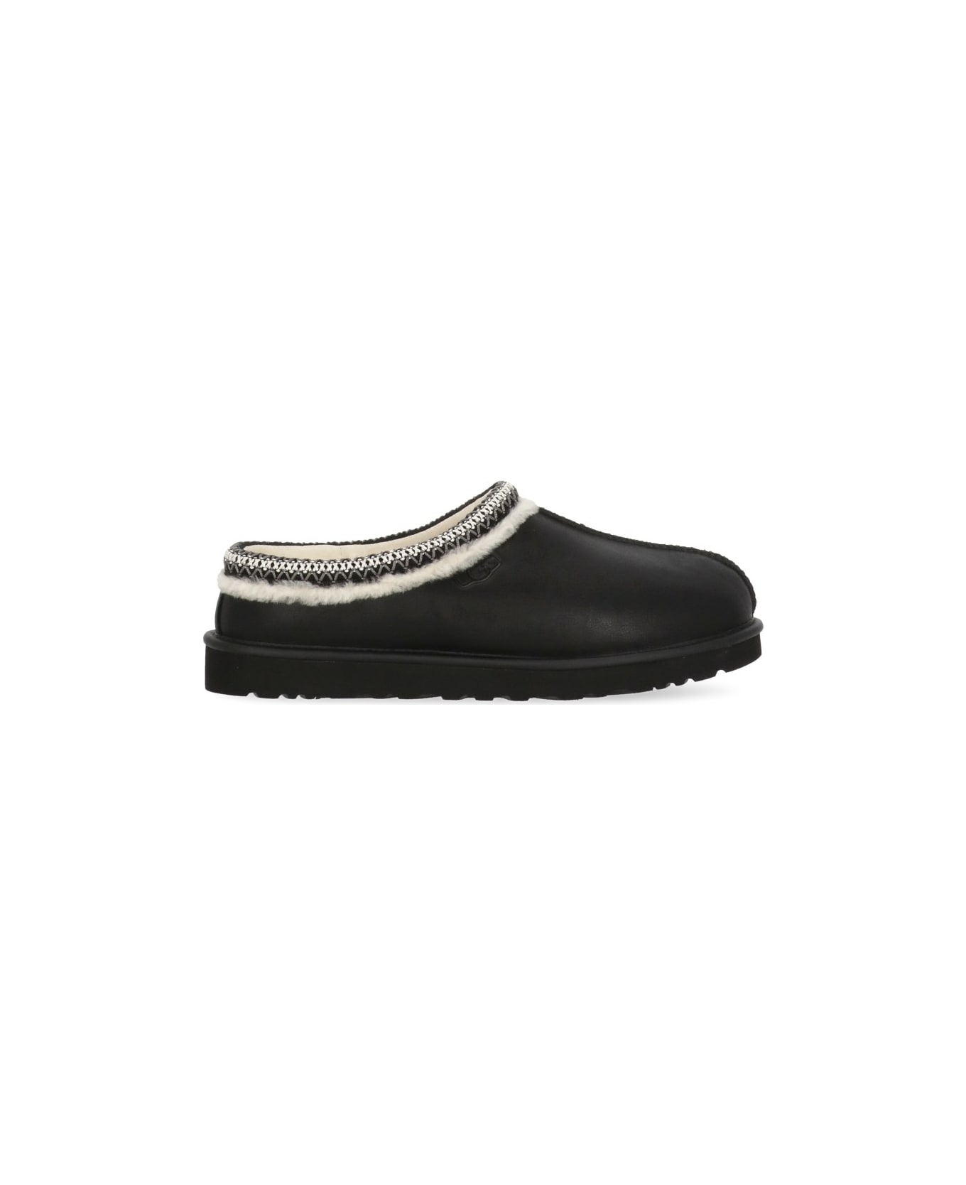 - UGG black woman's suede leather slippers - Round toe - Visible top stitches at ankle - Tone on tone UGG front logo - Rubber sole (2 cm)